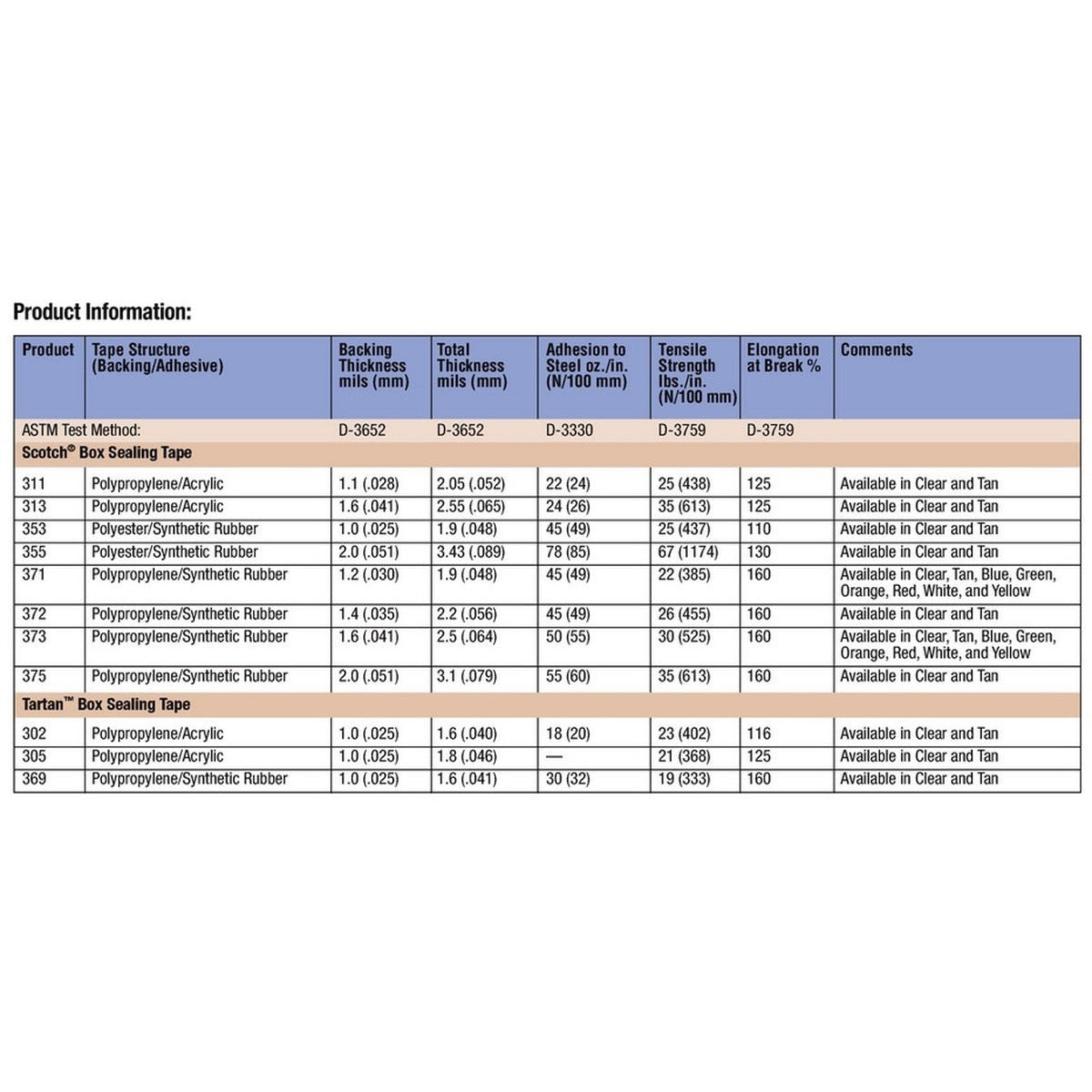 Scotch Box Sealing Tape 373 is a high performance packing tape that securely closes a wide variety of heavy weight box materials, including recycled fiberboard. The polypropylene film backing is easy to unwind and resists abrasion, moisture and scuffing. The backing easily conforms around edges and on rough surfaces for a tight seal.