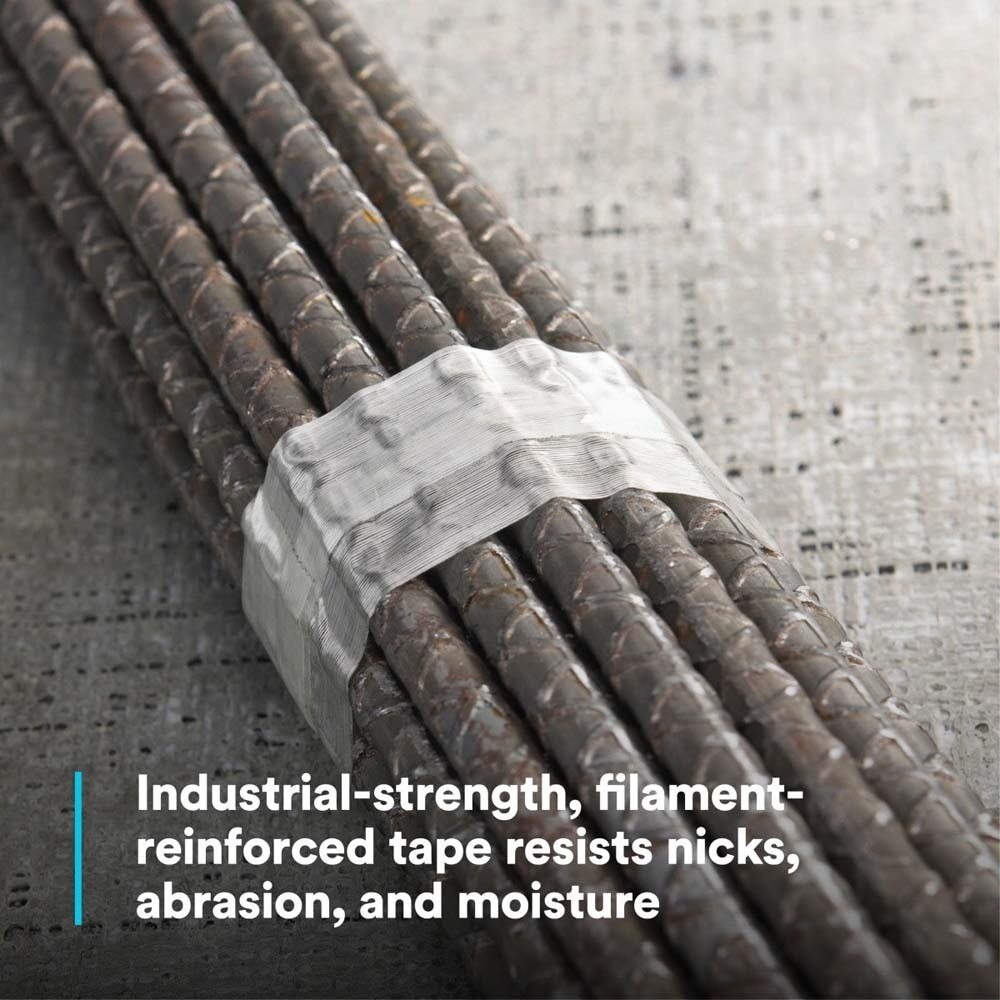 Industrial-strength clear filament tape with fiberglass reinforcement for high-tensile bundling, strapping, and L-clip closures; 72 mm x 55 m rolls with 6.6 mil thickness and synthetic rubber adhesive for strong bonding to corrugated, plastics, and metals.