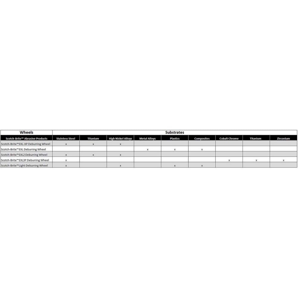 Scotch-Brite EXL Deburring Wheel features a hard, dense, nonwoven construction with silicon carbide mineral that quickly deburrs, finishes and polishes metals and other materials, delivering a smooth, clean finish with minimal pressure.