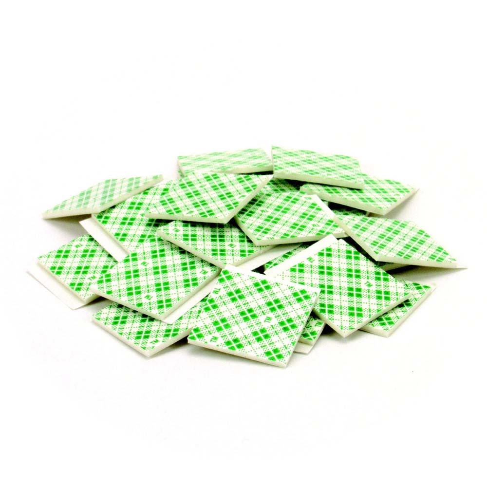 Off-white 1/16 in thick double-coated urethane foam tape squares with acrylic adhesive for strong, permanent mounting; ideal for interior signage, nameplates, and dispensers. Includes 1000 pre-cut 3/4 in x 3/4 in pieces with green plaid liner.