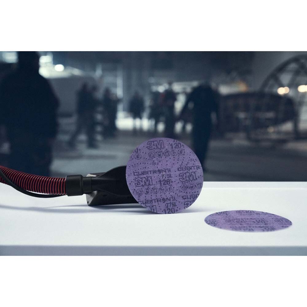 3M Xtract Cubitron II 775L Hookit Clean Sanding film discs feature 150+ grit precision-shaped abrasive on 6 in. hook-and-loop backing for efficient dust extraction and fast, consistent cutting in paint preparation, removal, general sanding, refining, blending, and featheredge applications.