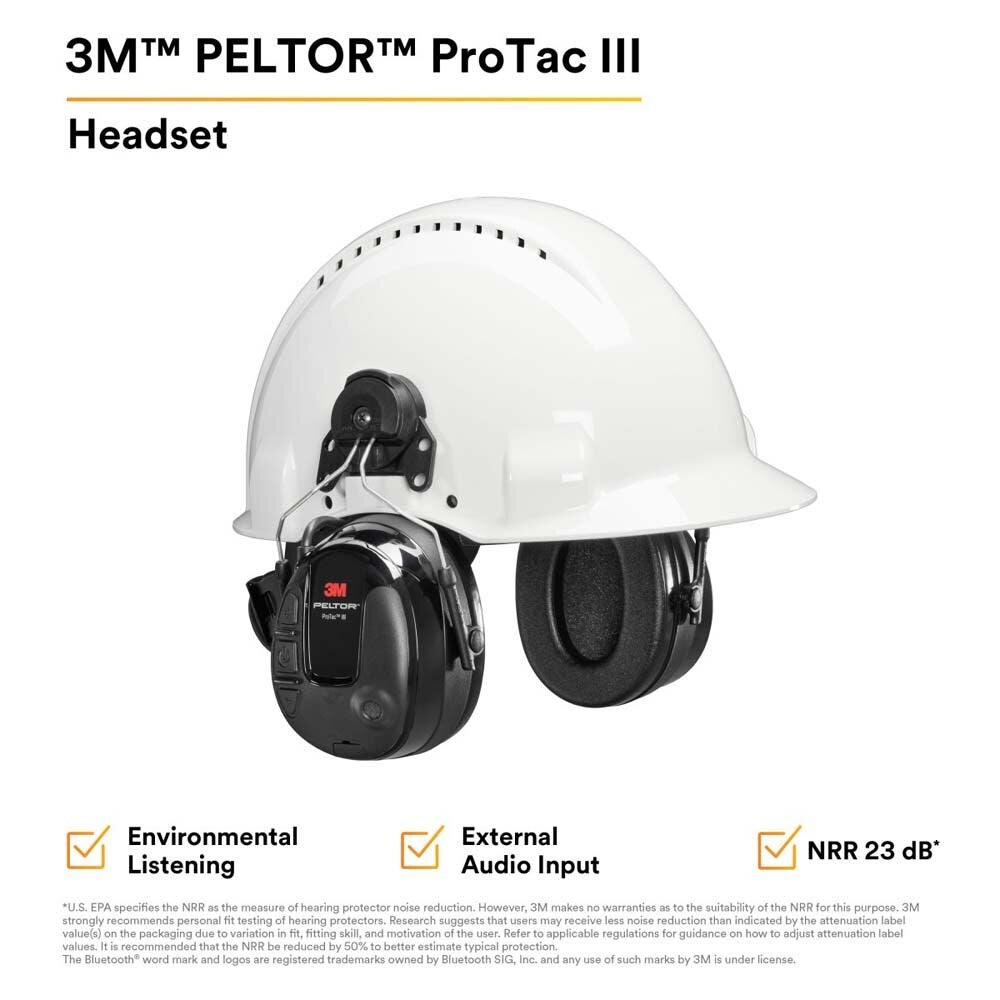 3M PELTOR ProTac III hard hat attached headset delivers professional electronic level-dependent hearing protection with a 23 dB NRR, allowing ambient listening while helping protect against hazardous noise. It features environmental microphones, user-friendly push-button controls, and a 3.5 mm listen-only stereo input for external devices.
