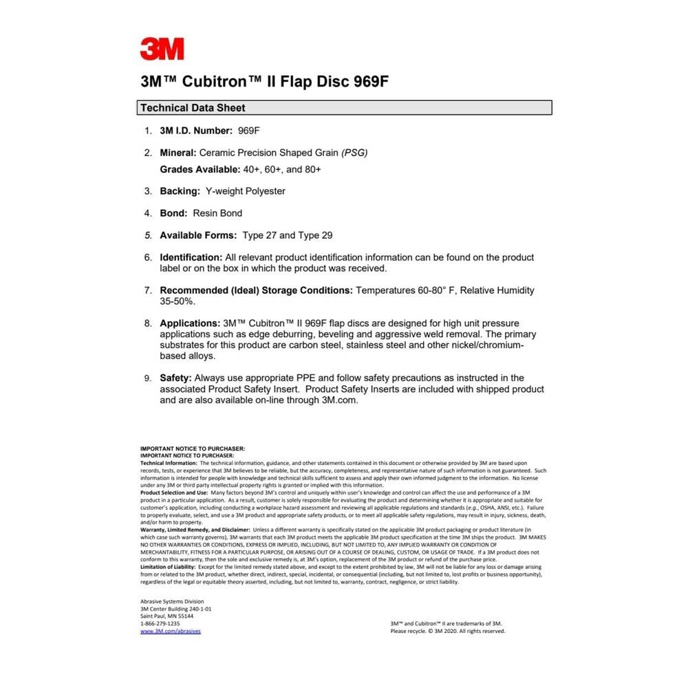 3M Cubitron II Flap Disc 969F with 40+ grit features precision-shaped ceramic grain on a durable polyester backing for fast, consistent cutting and a smooth finish. Designed for right-angle grinders, it excels at heavy grinding, aggressive weld removal, edge deburring and beveling on carbon steel and other metals.
