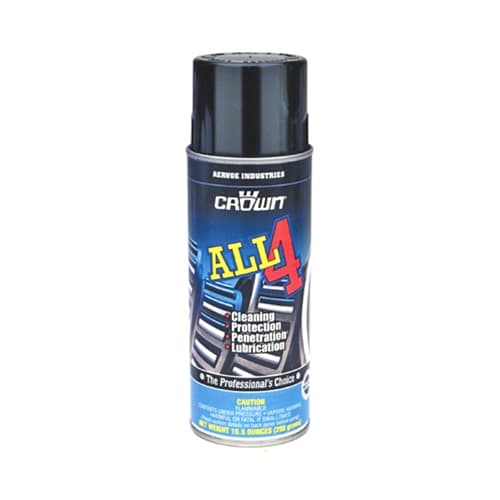 Clean, penetrate, lubricate and protect – does All-4! Crown All-4 displaces moisture, cleans, penetrates, lubricates, and protects. Low surface tension yields complete penetration and permits the lubricant to travel easily into small cracks and along threaded fasteners. It displaces moisture and penetrates deep to loosen scale and rust on frozen or sticking parts.