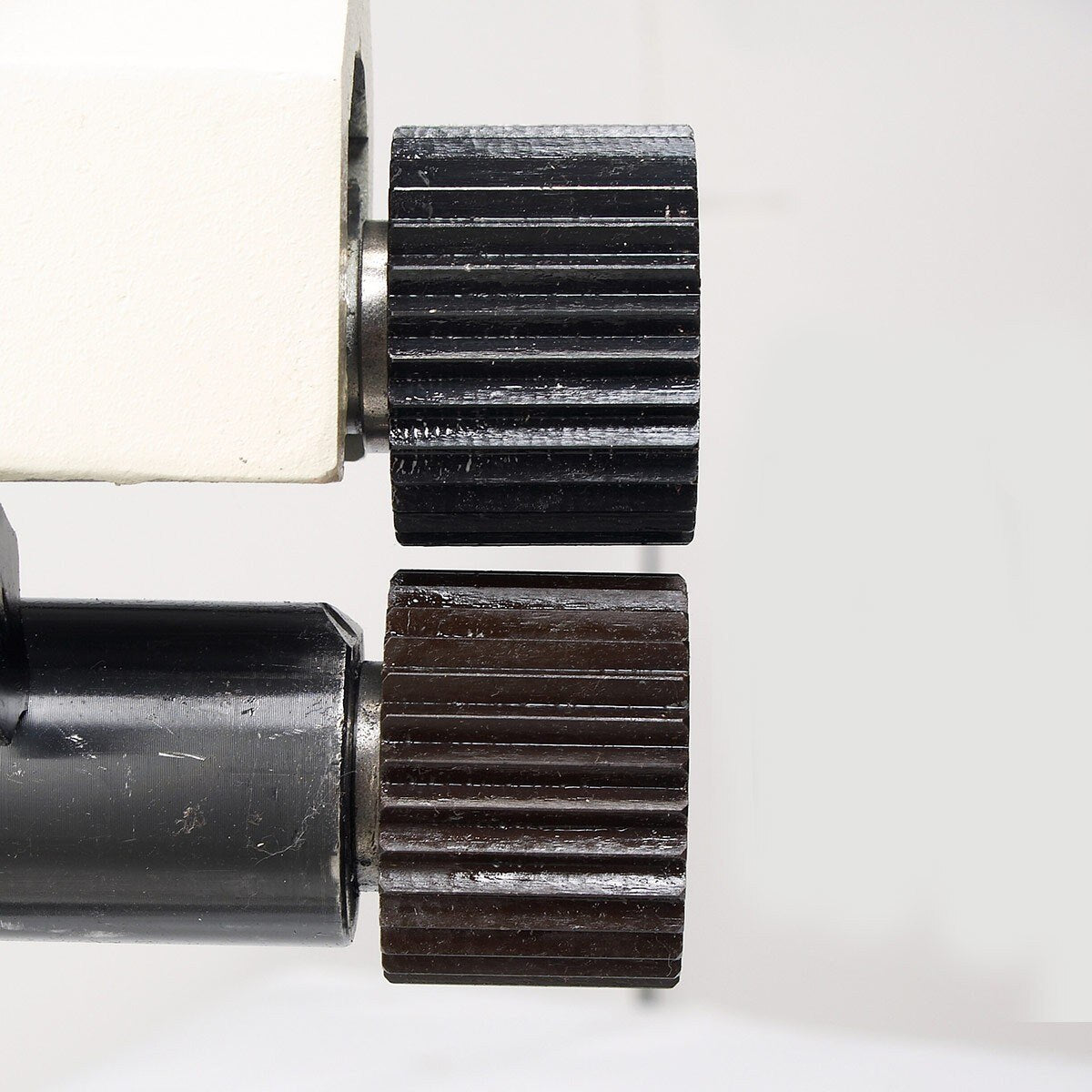 - Manual crank handle moves the rolls and pulls the material through.
