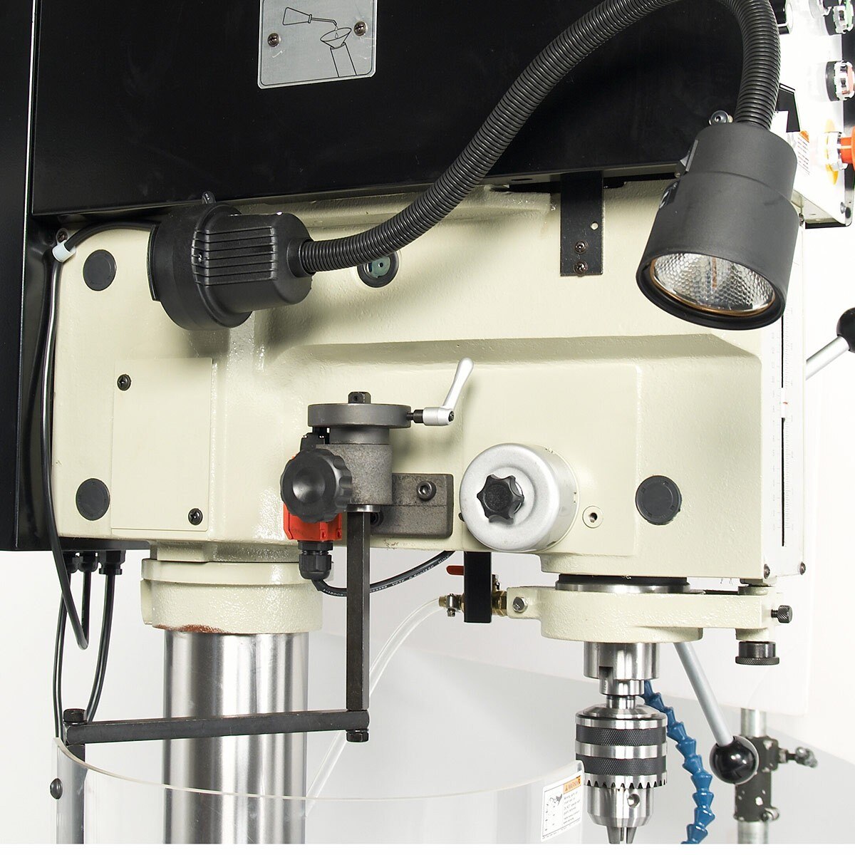 - Coolant system, stored in the base, sprays out at the end of the spindle behind the splash and safety guard to extend drill bit and tap lifespan.