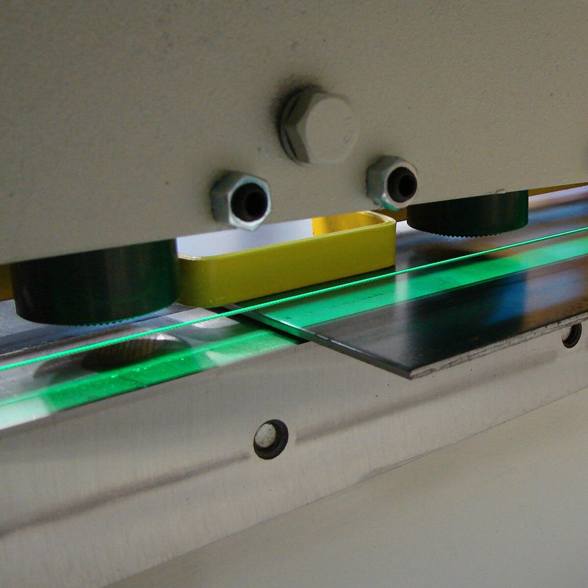 - Hydraulic hold-downs clamp the sheet solidly to the table, eliminating material lifting and improving blade life.