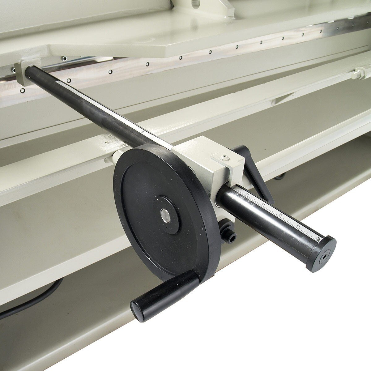 - Hold-down carriage with 9 fingers clamps the sheet metal firmly against the infeed table, improving blade life.