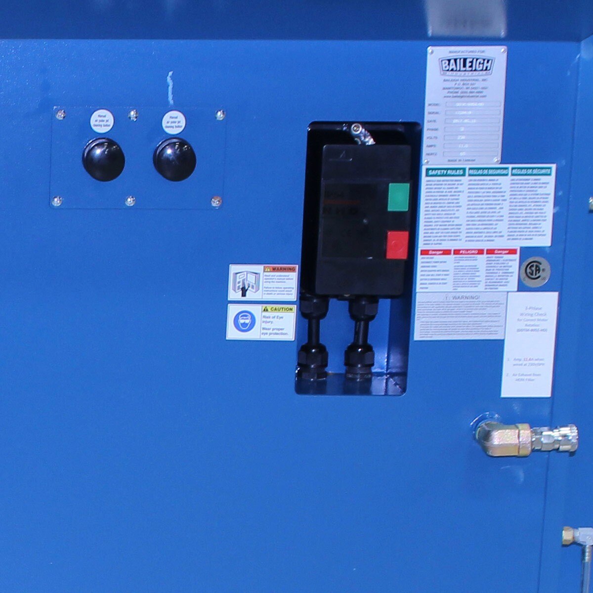 - Standard equipment included: HEPA filter, fire resistant cartridge filter, spark arresting metallic pre-filter, magnehelic gauge, hinged side walls w/ back wall, work light, auxiliary 110V and air tool outlets, 12” overhang, casters and leveling feet. These are all options other companies charge for, but come standard with Baileig