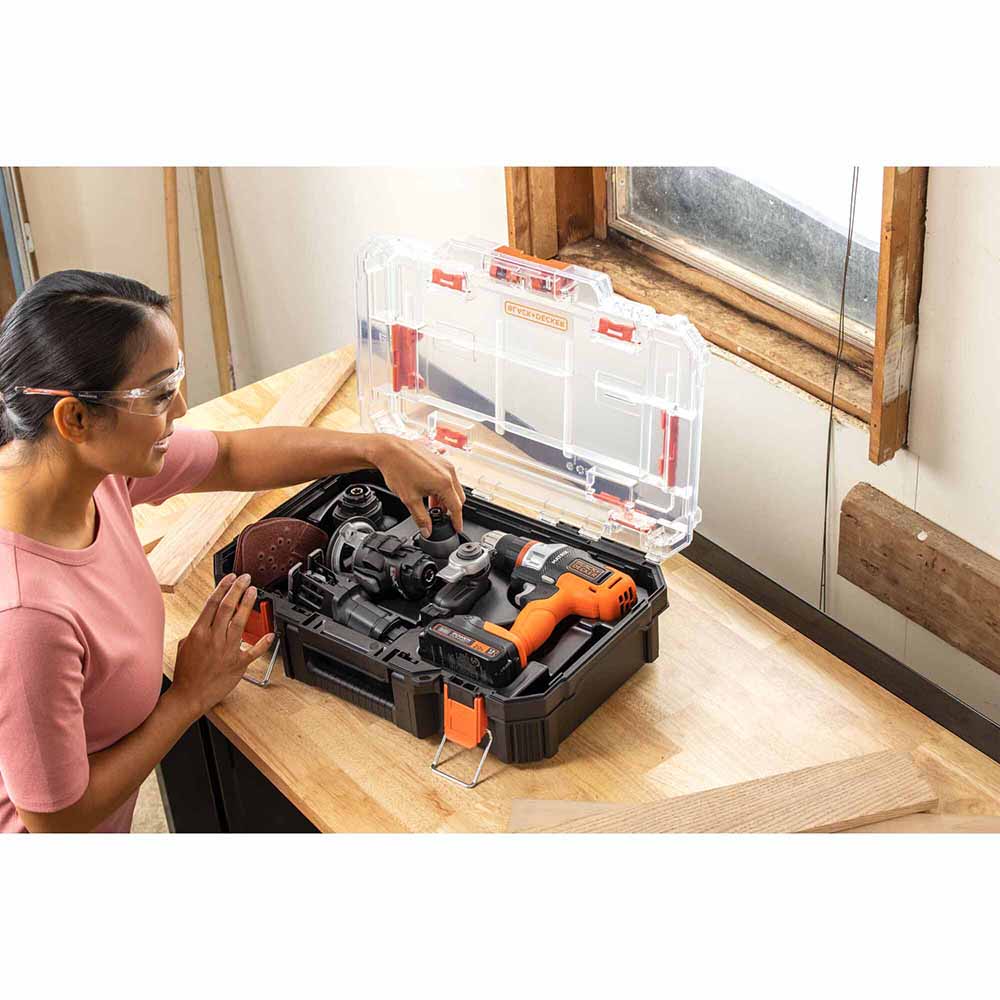 The BLACK+DECKER BDCDMT1206KITC Matrix 6 Tool Combo Kit is an all in one kit to tackle most jobs around the house. The 20-volt MAX Motor provides enough power for a full range of applications and attachments. The 20v MAX Lithium Ion Battery holds a charge up to 18 months so it is ready when you need it. The innovative Matrix Quick Connect System allows for quick and easy changing of all included attachments a Drill-Driver, Sander, Jig Saw, Oscillating, Router, and Impact driver attachments. The impact driver attachment delivers high performance output without kick back, along with a variable speed feature that allows for precision performance that is right for each job. The sanding attachment is a versatile product that can be used for finish sanding, rust removal, dry scrubbing, polishing, and detail sanding. The jig saw attachment is designed for tool-free blade changes for fast and easy change of blades, the router attachment delivers high speeds for fast trimming and decorative woodwork, and the oscillating attachment accepts a variety of BLACK+DECKER accessories (sold separately) which can be used to cut drywall, metal, wood, plastic, composite and many other materials.