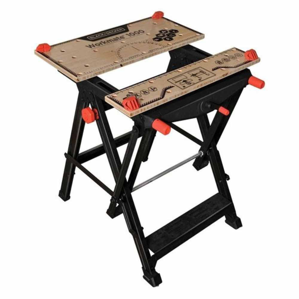 The Workmate® 1000 Portable Work Center and Vise features a fast One-Handed-Clamp™ system that allows clamps to be adjusted together or independently, and a quick-folding mechanism. Alarge working surface and a durable steel fame enable Workmate 1000 to support up to 550 lbs.