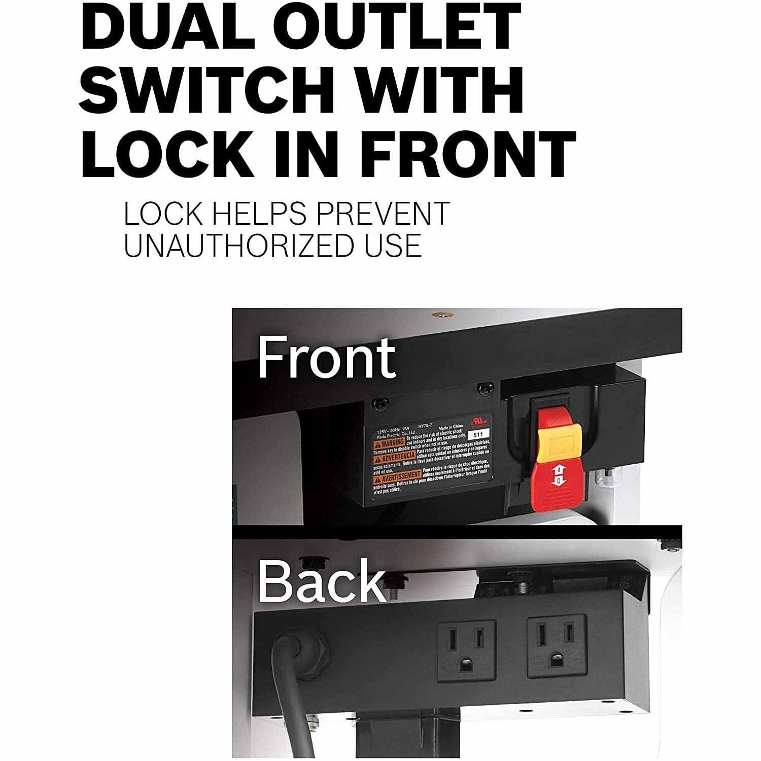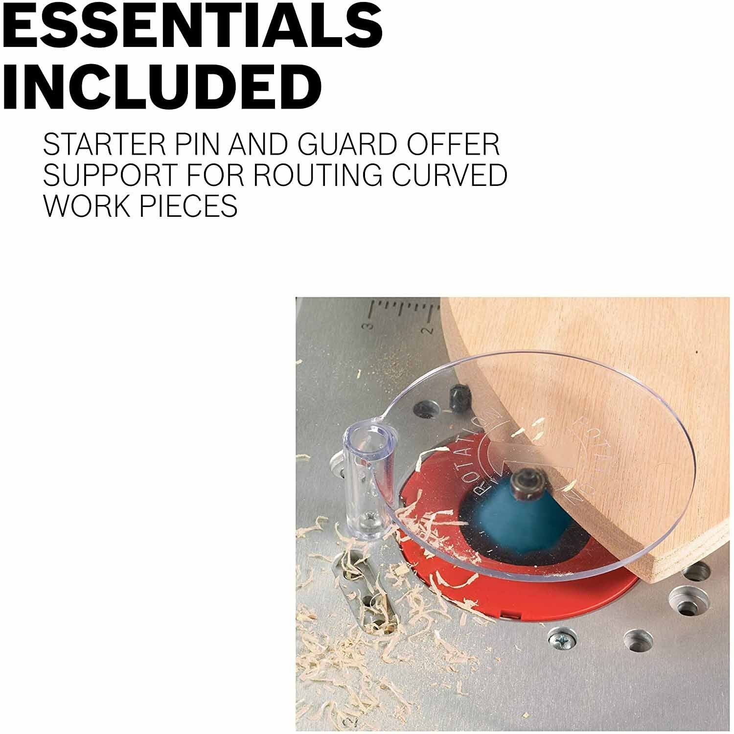 - Convenience: Featuring a dual outlet switch with 6 feet power cord; Includes bench top router table, aluminum router mounting plate, 3x mounting plate rings, mounting hardware, 2x adjustable feather boards, adjustable clear guard, starter pin and guard, and 2x out feed fence shims