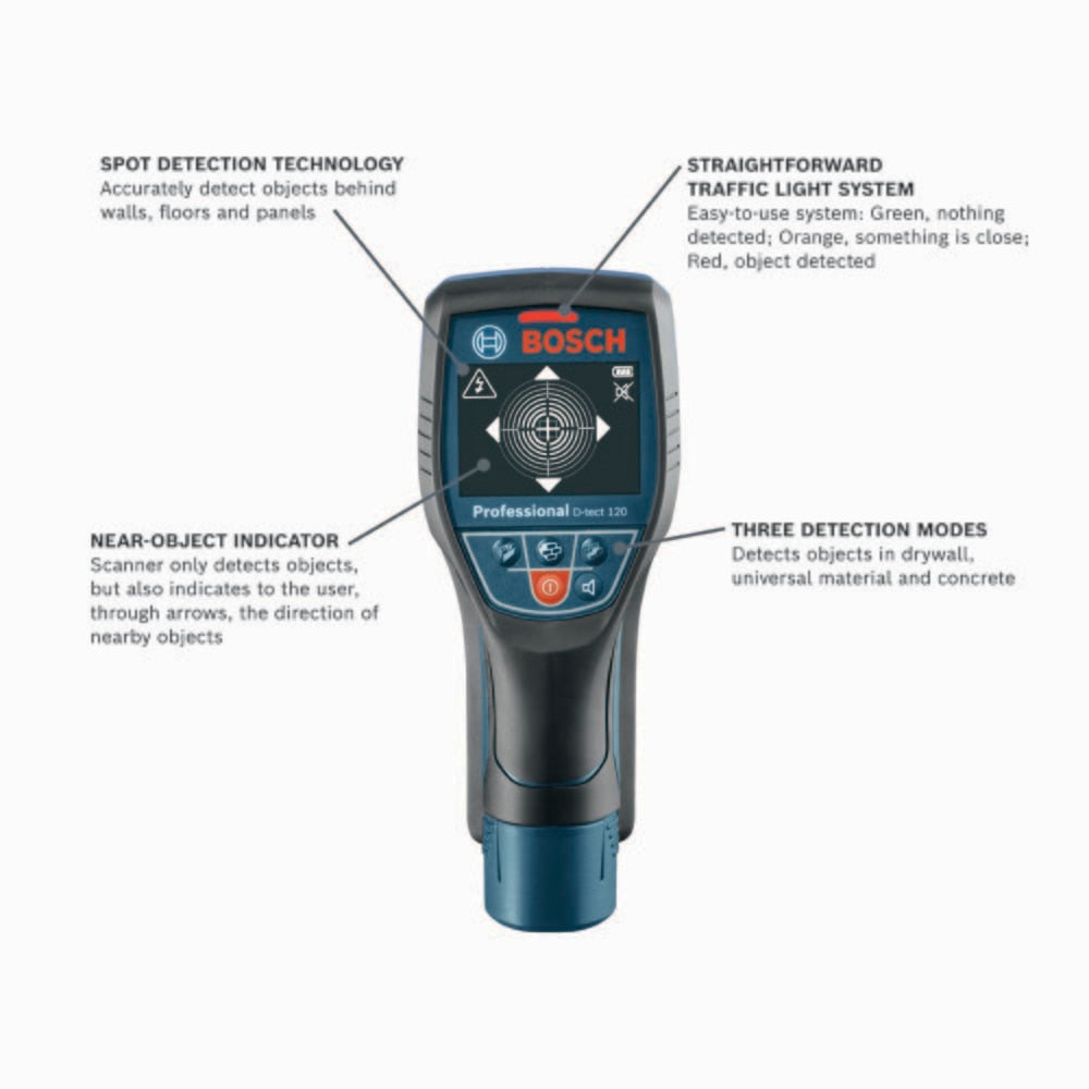 D-tect 120 features Spot Detection technology that can detect objects instantly when placed on a wall, panel or floor. Since the Bosch D-tect 120 never needs calibration, you can focus on the job without worrying about accuracy. Three modes ? drywall, universal and concrete ? make this the right detector for multiple jobs. Universal mode sees through more material, it sees "anything in anything." This device offers sound and a light to show user when something is detected behind a wall, panel or under flooring.