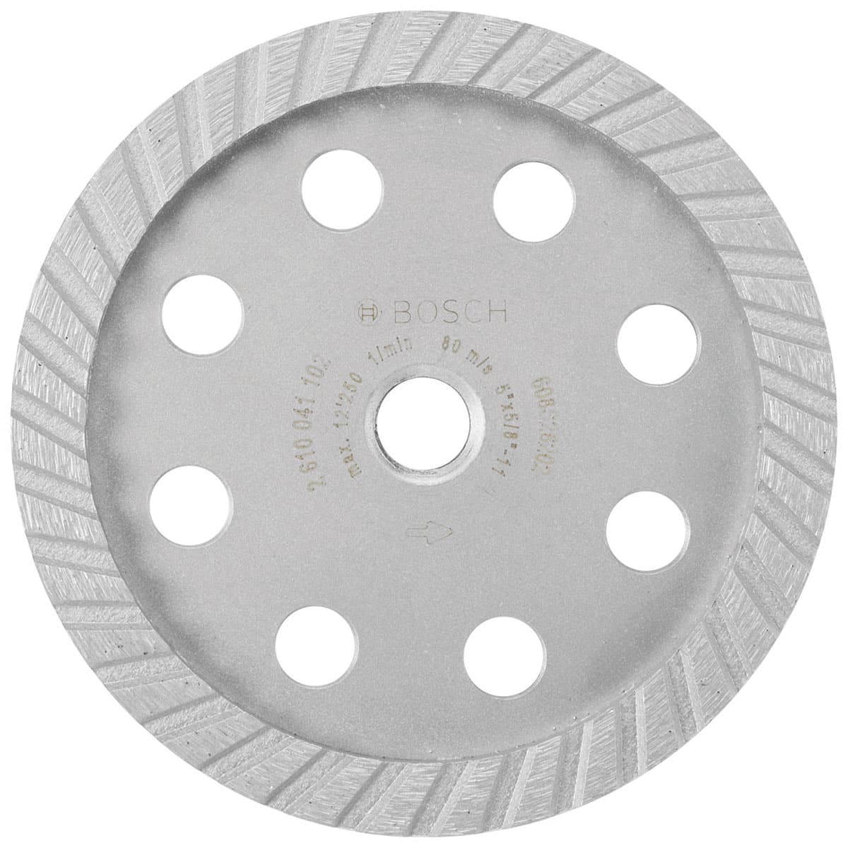 The Bosch Turbo Diamond Cup Wheel provides controlled material removal and a smooth final grind for concrete. Holes in the steel body were added to aid dust control. The wheel itself is precision balanced for less vibration and a better grind. The wheel is more durable than bonded abrasive wheels for concrete and masonry applications, and it can be used for wet or dry grinding. It features a spin-on thread interfaces for toolless mounting to an angle grinder.