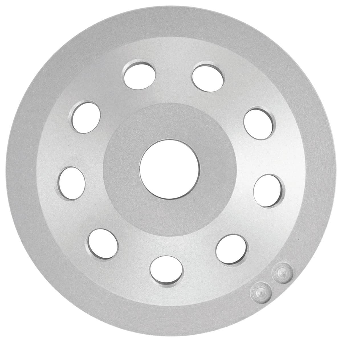 The Bosch Turbo Diamond Cup Wheel provides controlled material removal and a smooth final grind for concrete. Holes in the steel body were added to aid dust control. The wheel itself is precision balanced for less vibration and a better grind. The wheel is more durable than bonded abrasive wheels for concrete and masonry applications. It features a 7/8 In. arbor for use with a Bosch concrete surface grinder.