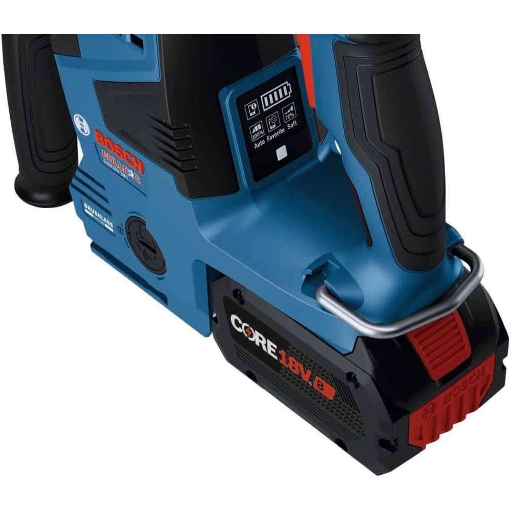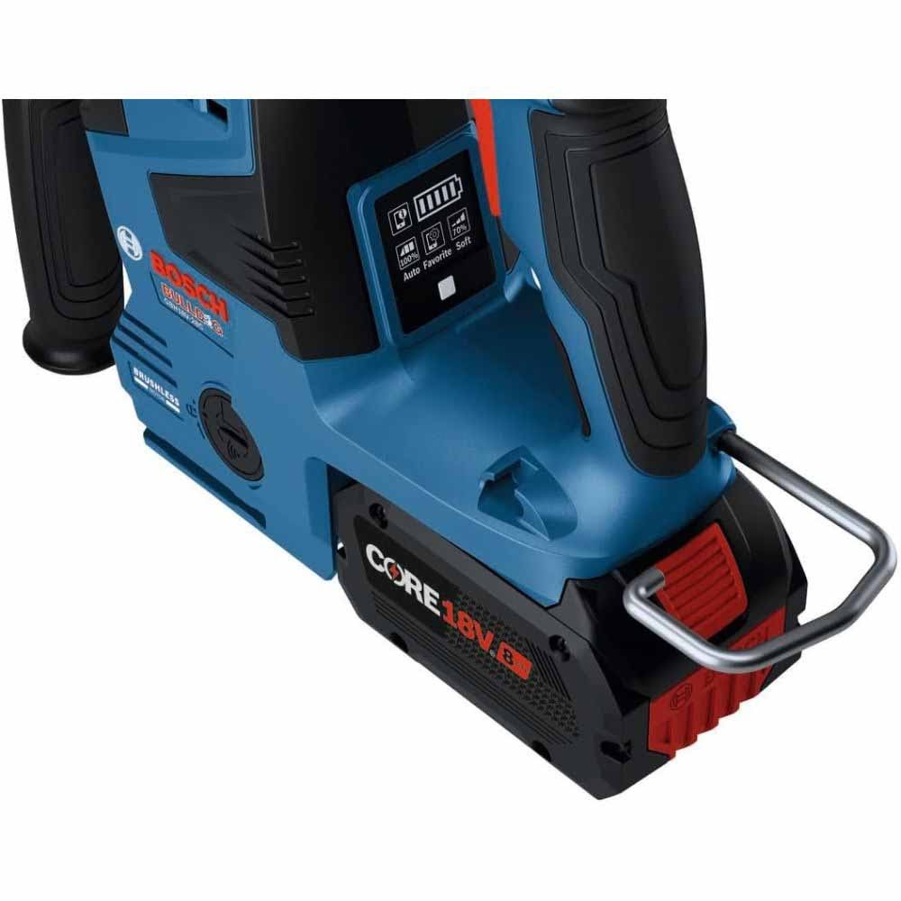 This Bosch Bulldog™ hammer provides superior performance and an outstanding impact-to-weight ratio. The GBH18V- 28C 18V Brushless 1-1/8 In. SDS-plus® Bulldog™ Rotary Hammer delivers 2.6 Ft.-Lbs. of impact energy (EPTA). It weighs only 7.3 Lbs. (tool only, not including battery). The hammer’s brushless motor maximizes battery runtime for extended performance. It has KickBack Control, which reduces the risk of sudden tool reactions in binding conditions, and an anti-vibration system featuring a built-in counter balancer. The ergonomic L-shaped design provides better control for both overhead and horizontal drilling applications. The 360-degree side handle provides a variety of grip positions for maximum ergonomics. The hammer features Vario-Lock to rotate and lock the chisel. This hammer features connectivity (module sold separately), providing a link to the free Bosch Toolbox app on a connected device to customize one of three different working modes (Auto, Favorite, Soft) to ensure the right setting for any job. And it has a user interface, which is an on-tool display helps manage tool performance for immediate feedback and control. The GBH18V-28C is compatible with an optional GDE18V-16 cordless dust-extraction unit (sold separately), delivering a self-contained dust solution for max mobility.
