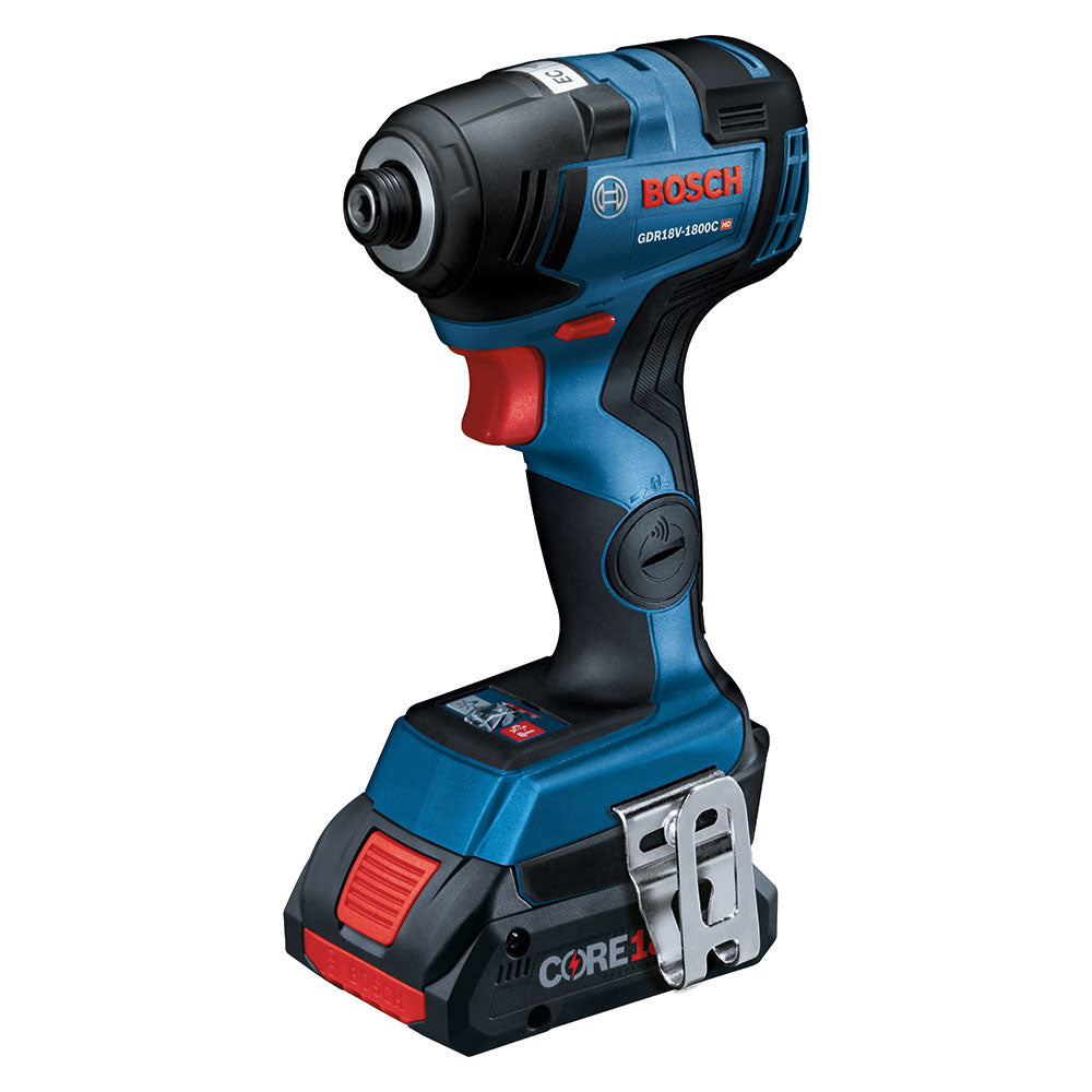 The GDR18V-1800CB25 kit features a 1/4 In. hex impact driver and two CORE18V 4.0 Ah Compact Batteries, each with next-gen Li-ion 21700 cell technology. The GDR18V-1800C 18V 1/4 In. Hex Impact Driver has a Compact Impactor design, with a head length only 4.9 In., giving it the best head-length-to-torque ratio on the market. It features the Bosch hammer-and-anvil system to produce 4,000 impacts per minute (ipm) as well as a 3,400 rpm speed. It is able to handle the toughest fastening tasks found on the jobsite. The kit features two CORE18V batteries, which have next-gen Li-ion 21700 cell technology for optimal performance in a lightweight, high-power battery. The driver has a Compact Impactor design, with a head length only 4.9 In. and a weight of only 2.4 Lbs. (tool only, not including battery). It has a variable-speed trigger and an LED light.