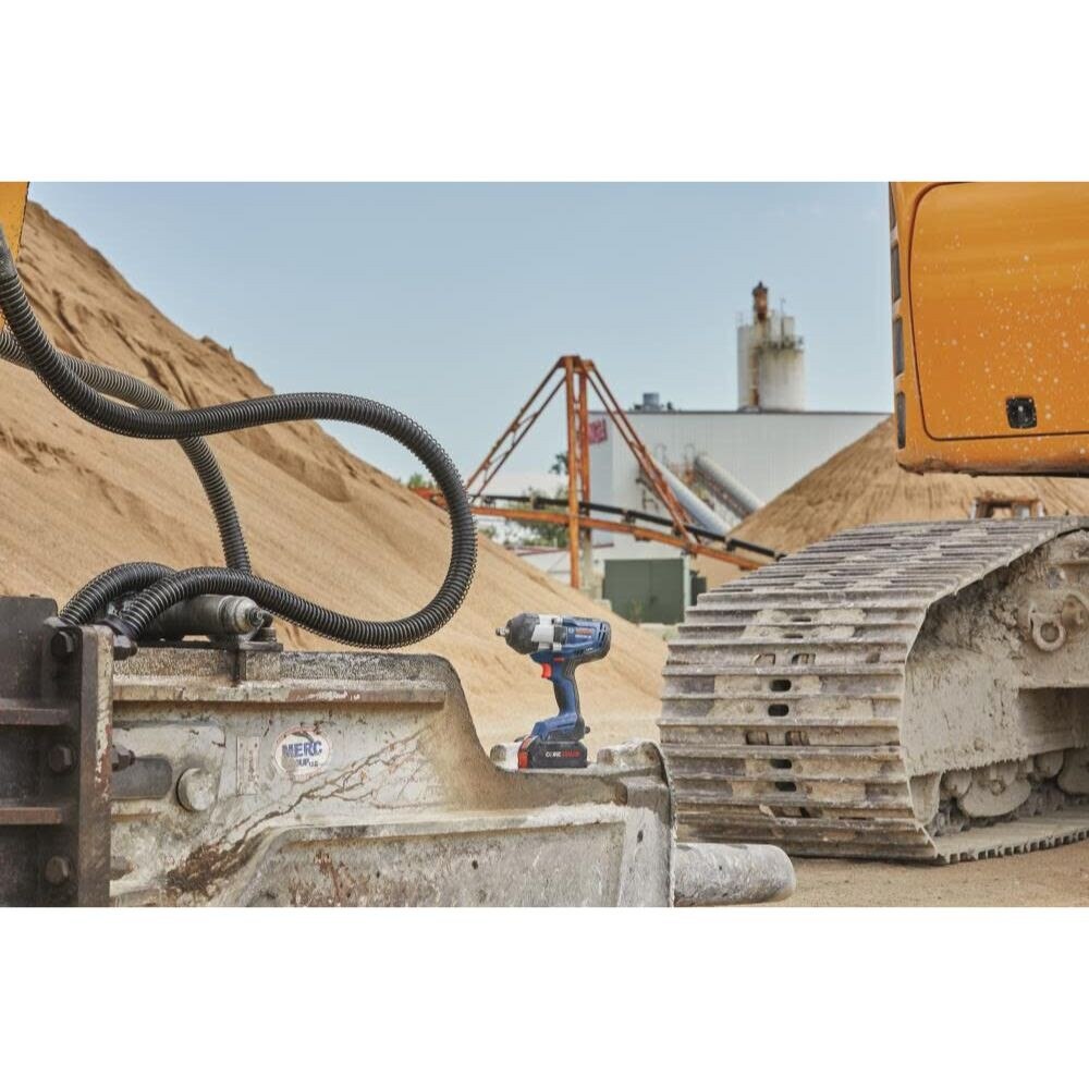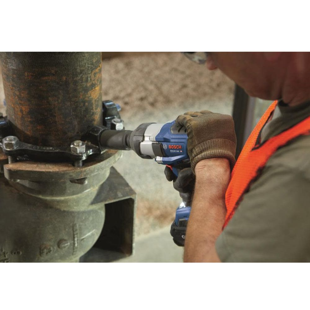 The Bosch PROFACTOR™ GDS18V-740C 18V Connected 1/2 In. Impact Wrench with Friction Ring is designed for breaking free and driving large bolts, nuts and anchors quickly. It is part of the PROFACTOR™ System, which pairs BITURBO Brushless™ Technology with a CORE18V® High Power Battery. BITURBO Brushless™ Technology is a high-performance motor and drive-train system designed to deliver power comparable to high-demand corded tools. The tool delivers up to 740 Ft.-Lbs. fastening torque and 1,180 Ft.-Lbs. breakaway torque, while maintaining long runtime. In addition to three speed/torque settings this impact wrench also features special modes to help prevent workpiece and fastener damage. The presets include modes for metal screws and wood lag screws. Additional modes and customizations for specific screws and materials can be set and saved to the tool via the Bosch Toolbox App (connectivity module included). In reverse, with bolt mode activated, the Auto Bolt Release stops rotation when there is no load on the tool to help prevent accidentally dropping bolts and nuts during removal. In addition to customizing settings and modes, connectivity (connectivity module included) provides tool specific information and feedback. The variable-speed trigger provides accurate driving speed. It also has an LED light system to illuminate the work area. The wrench features a rubber head casing that helps protect workpiece and tool from damage. The kit includes a CORE18V® 8 Ah High Power Battery, which delivers 50% more runtime and over 75% more power than the CORE18V® 4 Ah battery, powering high-demand applications.