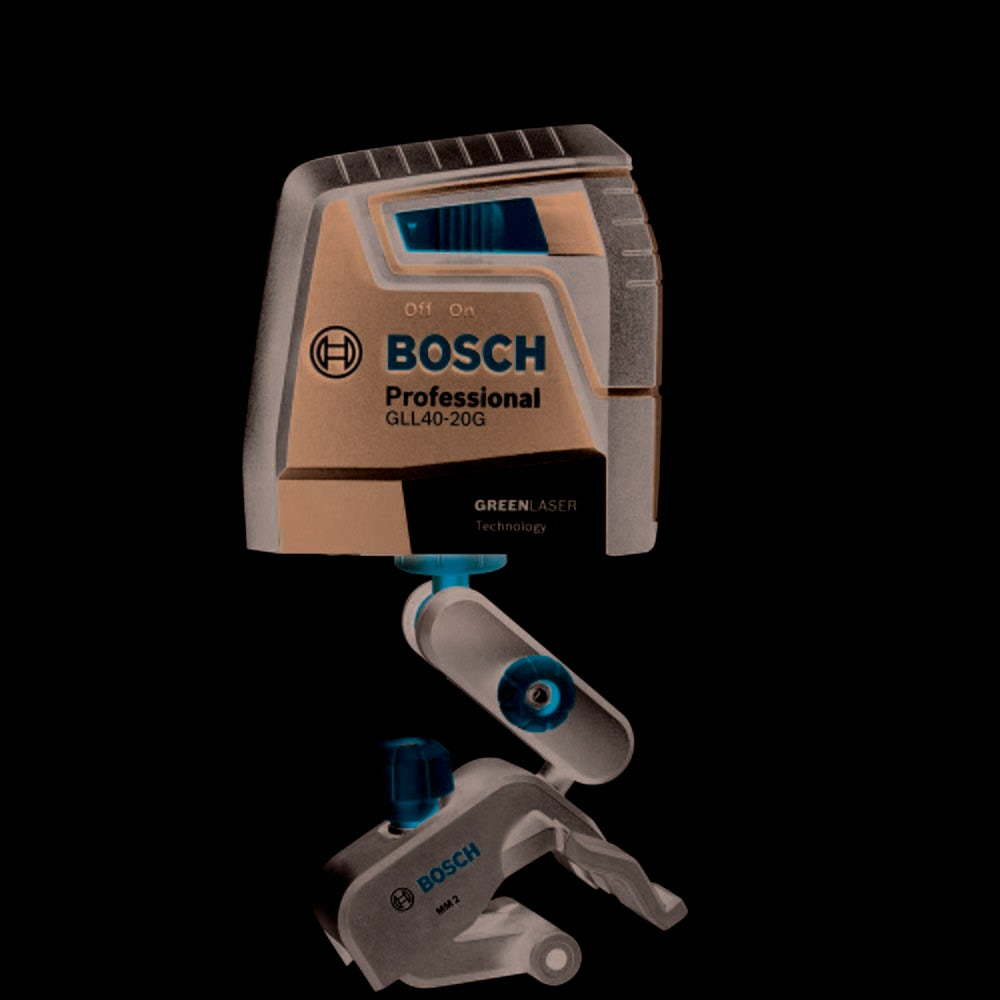The Bosch GLL40-20G Self-Leveling Cross-Line Laser projects visible green laser lines, which are up to 4X brighter than standard red beams. The tool has a working range of up to 40 Ft. and offers reliable accuracy of ±5/16 In. at 30 Ft. It features Bosch-exclusive VisiMax™ technology, which monitors tool temperature and power consumption to deliver the brightest line for the job, optimized energy efficiency and long-term tool reliability. The cross-line laser is also equipped with a Smart Pendulum System allowing for automatic self-leveling and indication of out-of-level condition, as well as pendulum lock for safe tool transport. The included MM 2 Flexible Mounting Device provides a rotating 360° neck for quick setup and simple fine-tuning allowing for the laser to be clamped onto virtually any surface from 1/2 In. to 2-1/4 In. thick.