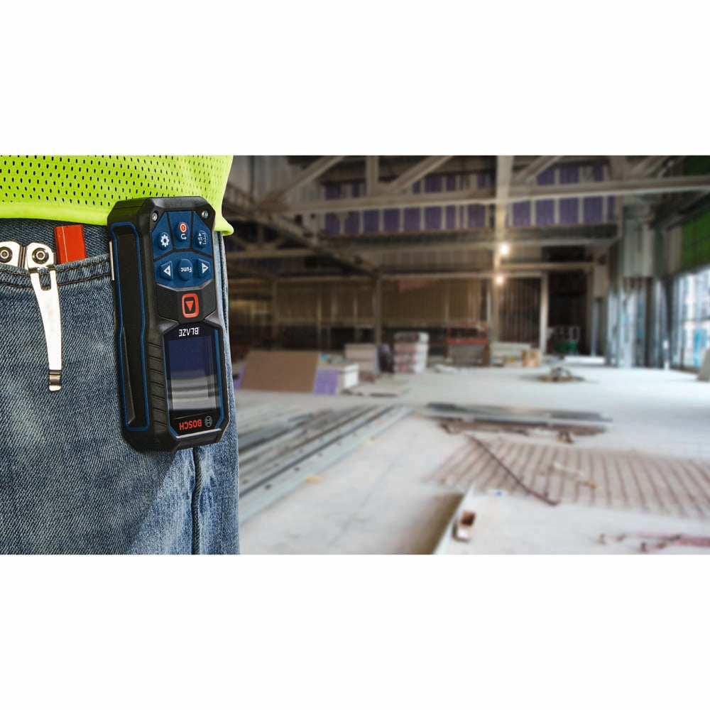 This 165 Ft. laser measure is a fully featured tool with an easy-to-read color display, great accuracy, an inclinometer for tilt angle and reinforced housing for durability. The Bosch BLAZE™ GLM165-27C features an inclinometer, which shows the tilt angle up to 360Ð for easy angle and indirect measurements. The laser has accuracy up to ѱ/16 In., plus it includes a rounding button that rounds the measurement to the fraction that best suits the application and haptic feedback for loud jobsites. The digital laser measure also offers Bluetooth® functionality, so users can digitally transfer measurements to a smartphone or tablet through the free MeasureOn app. It also has full rubber overmold housing, designed to be similar to a roll cage. It is IP65 rated and has an ergonomic design for better grip. It includes 11 different measuring functions, including real-time length, length, area, volume and indirect functions, and addition/subtraction capability.