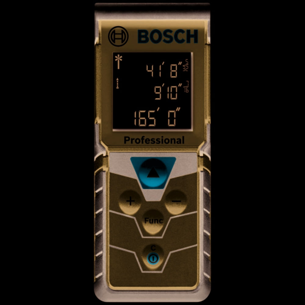 The Bosch BLAZE™ Pro GLM165-40 165 Ft. Laser Measure is a fully featured yet simple-to-use tool. It provides an easy-to-read backlit display that illuminates the measurements, and it delivers real-time distance, distance, area, volume and indirect measuring functions. It has a 10-measurement storage capability. This measure has addition/subtraction functionality, so the user can add or subtract measurements. The BLAZE™ Pro includes default real-time measurement mode, adjusting the measurement the closer to or further from the target the laser measure is. It has laser precision technology and real-time measurement mode, for instant and reliable measurements up to 165 Ft., to size up the job in seconds. It is accurate up to ±1/16 In. and features a digital level. It fits in any pocket for easy access.