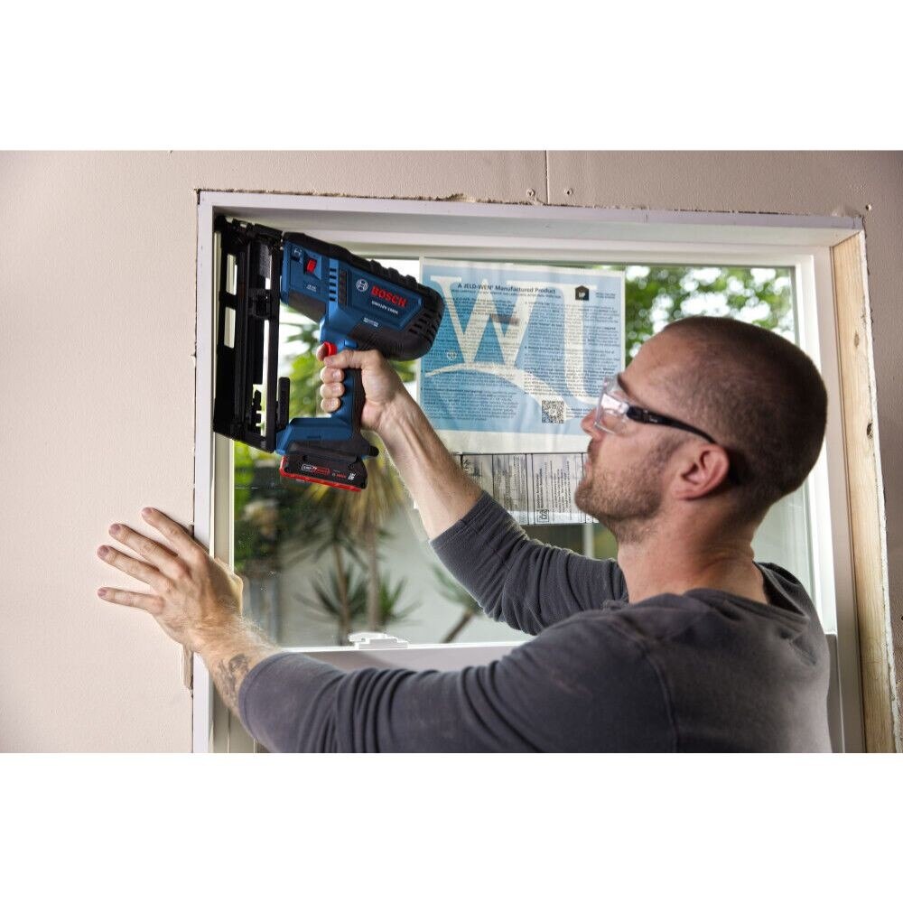 The Bosch GNH18V-16MA 18V Brushless 16-gauge Angled Finish Nailer delivers power and precision in a cordless solution. Compact and ergonomically designed, the 16-gauge angled finish nailer operates at a 20-degree angle giving workers the flexibility to access tight spaces, while also helping reduce worker fatigue. The efficient, brushless motor delivers the power to consistently sink 16-gauge angled finish nails ranging from 1-¼ In. to 2-½ In. which makes it ideal for fastening interior trims, crown moldings, baseboards, window and door casings and other dense wood applications. The 16-gauge finish nailer features an angled magazine with a capacity of 105 nails. When paired with a CORE18V 4 Ah battery (Kit includes 2Ah battery; 4 Ah battery sold separately), it can fasten up to 1,600 nails per charge, ensuring extended productivity. One-handed activation simplifies operation for quick and hassle-free nailing that is suitable for both right- and left-handed users. Equipped with a large viewing window and a no-mar contact tip, the 16-gauge angled finish nailer provides superior line of sight, helping minimize costly mistakes by giving workers improved sight of the workpiece while in use. The dry-fire lockout feature automatically stops operation when down to the last five nails. This not only prevents blank firing but also safeguards the workpiece from potential damage. Make easy and precise adjustments to the depth setting with the ergonomic thumb wheel. Additionally, downtime is minimized as jammed nails can be quickly cleared through a tool-free release mechanism while on the job. An intuitive user interface allows for easy toggling between single and bump-fire modes, turns the LED light on and off, and informs the worker of scheduled maintenance of the tool. An integrated heavy-duty belt hook provides easy portability and storage between tasks. The kit features a standard 18V 2 Ah Battery and 18V Standard Battery Charger.
