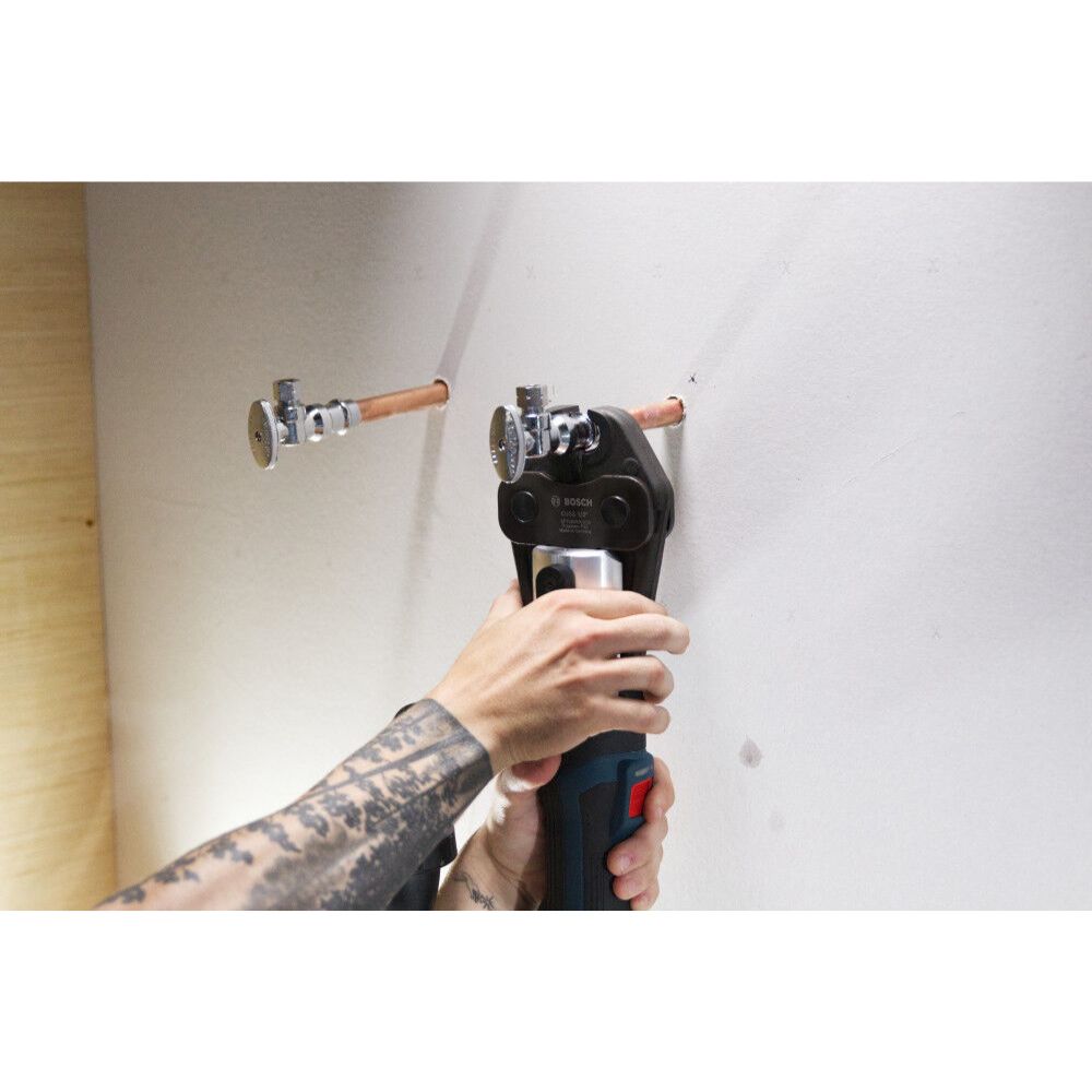 The Bosch GPT18V-32 Press Tool delivers fast pipe connections without a torch and solder, removing the need to drain water out of pipes before joining. The elongated design and rotatable head help workers access tight spaces with greater ease. With a powerful clamping force, get reliable full connections in ½ In. to 4 In. pipes in about 3 seconds per press cycle. Equipped with an LED status indicator for operating feedback and an LED worklight to help illuminate dark, hard-to-see workspaces. The electronic motor protection feature helps protect the motor from overload and the battery cage helps protect the battery from impact damage. Use with our complete line of Bosch press jaws for a range of pipe sizes and materials. Also compatible with industry-standard press jaws for greater flexibility.