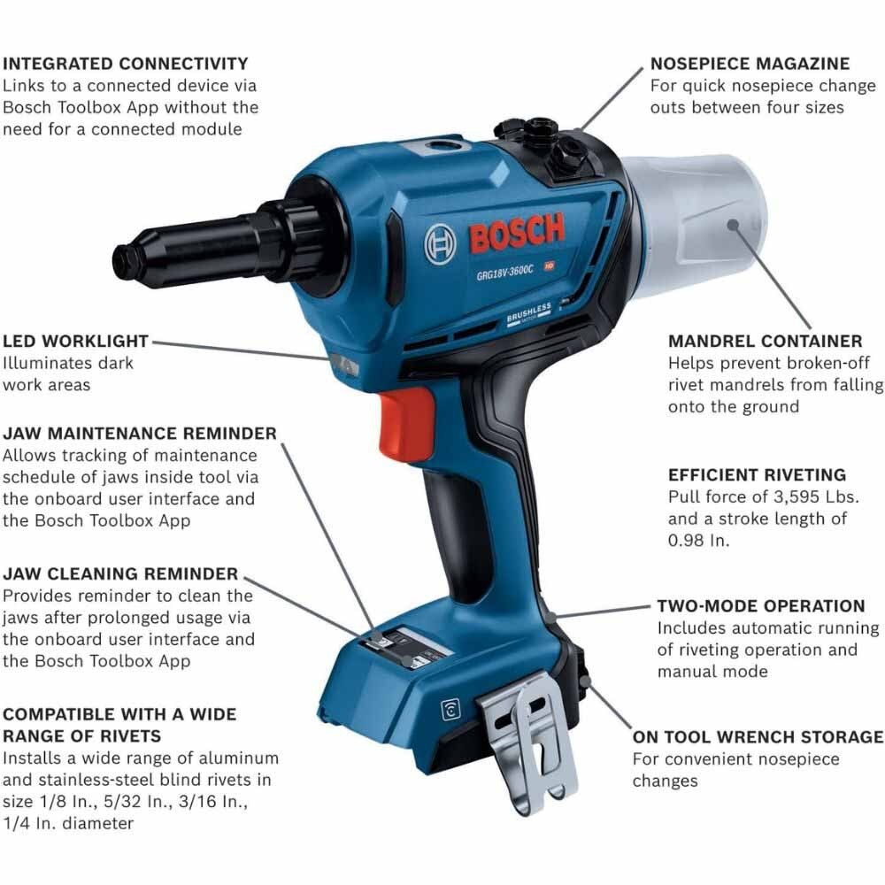The Bosch GRG18V-3600C 18V Brushless Connected Rivet Tool conveniently installs blind rivets without changing internal tool components, which helps to get the job done faster. It pulls a wide range of aluminum and stainless-steel blind rivets from 1/8 In. to 1/4 In. diameter. The rivet tool features two modes: automatic running of the riveting operation and manual mode for individual fastening control. It delivers a constant pulling force of 3,595 Lbs. and is designed to provide balanced handling. The rivet tool includes a nosepiece magazine, four nosepieces in different sizes and a nosepiece wrench. Each item is easily accessible on the upper part of the tool. It also features built-in connectivity, letting the user link to a connected device via the Bosch Toolbox App to customize settings and receive detailed feedback. The Jaw Maintenance Reminder, accessible via onboard user interface or the App, allows tracking of the maintenance schedule of the jaws. The Jaw Cleaning Reminder, also accessible via onboard user interface or the App, provides a reminder for cleaning the jaws after prolonged usage. The mandrel container helps prevent broken-off rivet mandrels from falling onto the ground. This 18V rivet tool helps maximize productivity on the jobsite with quick and convenient rivet installation.