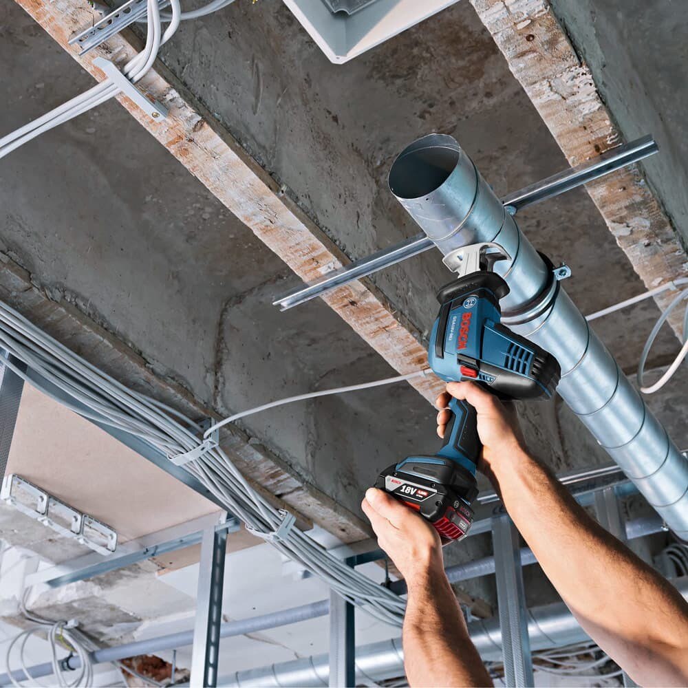 The Bosch GSA18V-083B 18V Reciprocating Saw is built to easily move through difficult tasks in tight spaces that other recip saws can't fit. It has the best power-to-weight ratio in its class, and delivers a fast 3,050 strokes per minute. At only 15-3/4 In. long and 4.4 Lbs. (bare tool), this powerful, compact cordless recip saw provides an impressive 0.83 In. stroke. This allows electricians or plumbers to remove more material per stroke. The tool's light weight is ideal for continuous cutting in over-the-head applications. The easy-to-operate blade-change system allows for fast toolless blade changes, and its LED light helps to illuminate the cutting zone. This tool comes with a lock-out switch, to prevent inadvertent startup of the tool, for added user security. The GSA18V-083B is a bare tool; the battery and charger are sold separately.