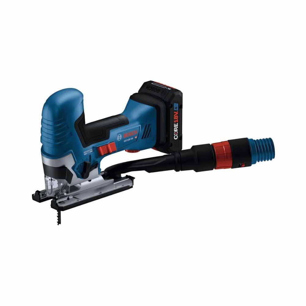 This 18V cordless jig saw is engineered for curve cuts, delivering strong and manageable power. The Bosch GST18V-50B 18V Barrel-Grip Jig Saw provides corded performance, with a cutting capability up to 4.9 In. in wood and 500 to 3,500 strokes per minute speed. It provides a variable-speed dial allows matching the speed to material. The jig saw has four orbital-action settings for cut control. The large die-cast aluminum footplate with no-mar plastic overshoe to help prevent damage to the workpiece. It is compatible with guide rail and circle adapter. The cut lines stay visible due to the dust blower and LED light. The jig saw features a tool-free T-shank blade-change system.
