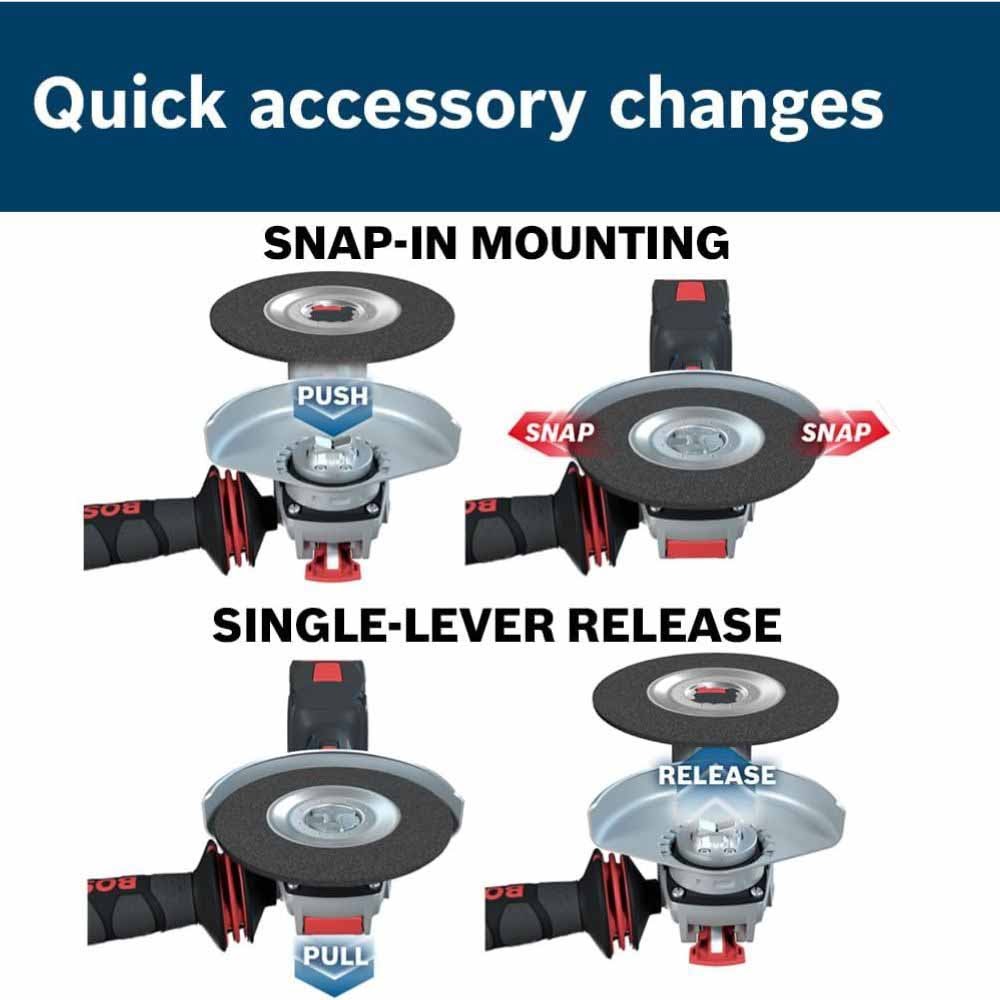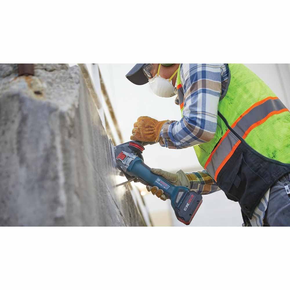 The Bosch GWX18V-10P 18V Brushless 4-1/2 – 5 In. Angle Grinder is an ergonomic, robust grinder that is engineered with a narrow grip zone for best user comfort and considerable power. It delivers the ultimate combination of performance, control, and power in a cordless grinder. It features the innovative X-LOCK mount, with a wheel change interface that's up to five times faster than conventional interfaces. There’s an audible snap when mounting an X-LOCK wheel on an X-LOCK grinder. The wheel mounts properly without the need for a spanner wrench or flange nuts. The wheel is released from the grinder with the pull of a lever. The grinder’s brushless motor provides performance comparable to a 10-amp corded grinder and greater efficiency that maximizes runtime and productivity. The grinder has an X-Brake, which helps provide a rapid stop of the wheel when the switch is turned off. It also includes other advanced electronics such as KickBack Control, restart protection, and constant electronics for constant speed under load. The grinder features a multi-grip paddle switch, which provides increased grip options for better comfort and control. The switch has a no lock-on feature, which shuts motor off after the paddle switch is released. The grinder features an updated gearhead mounting collar that's now compatible with all Bosch metal and concrete guards.