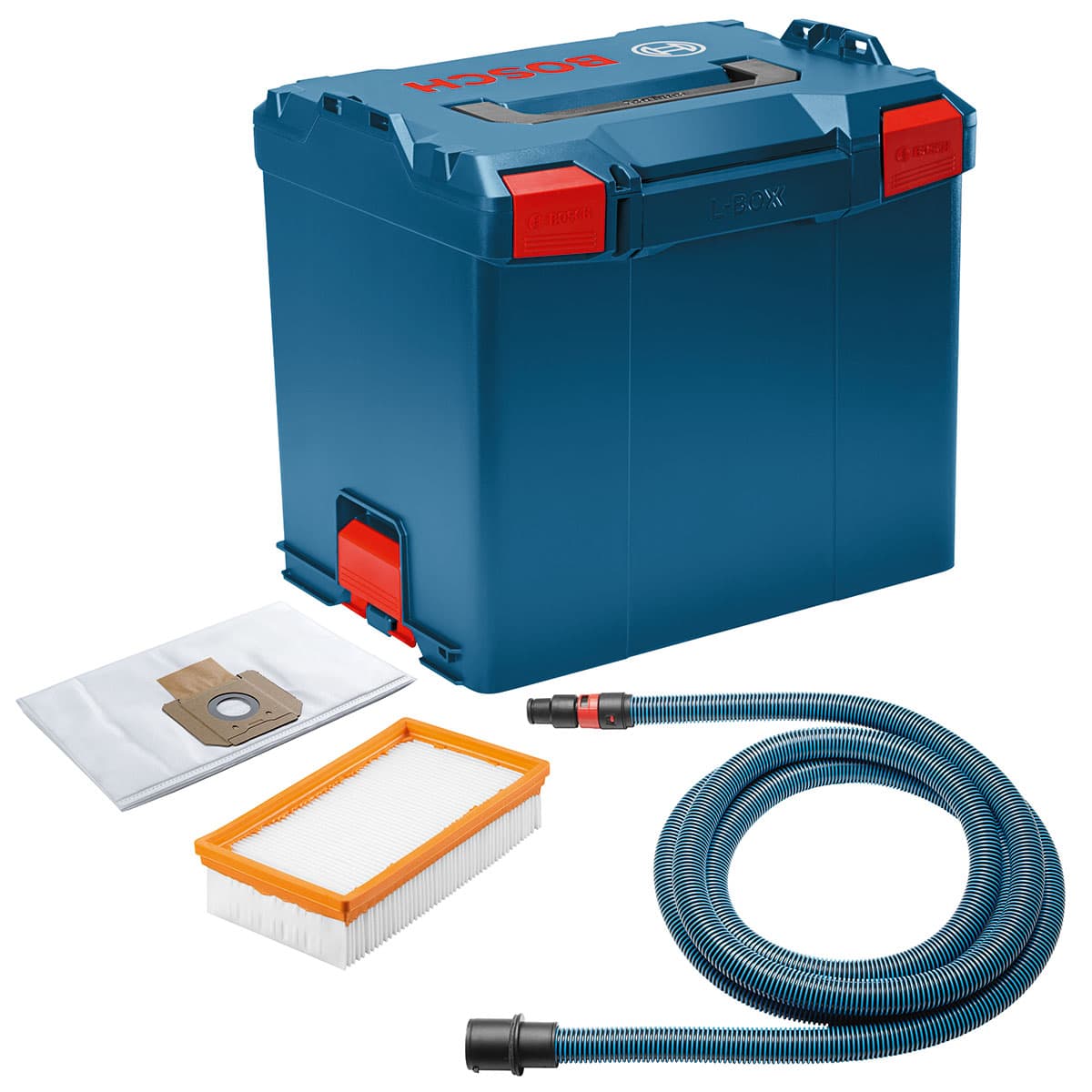 The Bosch GXA4-01L PRO+GUARD™ Surfacing Kit features a HEPA filter, fleece filter bag and other accessories to upgrade the VAC090-series dust extractor. The VF130H HEPA Filter captures 99.97% of particles 0.3 microns and larger, and it has a low-stick surface to enhance the filter-cleaning process. It helps users move toward compliance with the OSHA respirable crystalline silica dust regulation. The VB090F Fleece Filter Bag acts as a preliminary filter, and the port cover securely closes to keep the dust inside during disposal. The filter and fleece bag are for use in dry applications only. The VH1635A 16 Ft., 35mm Anti-Static Dust Extractor Hose is engineered specifically for Bosch VAC series dust extractors. This crush-resistant hose helps prevent static shock, and it features a locking ring that securely connects to many Bosch power tools and dust-extraction attachments. The L-BOXX-4 tool carrying case (part of the L-Boxx® tool-storage system) is also included. The case integrates with the dust extractor for a mobile workstation.