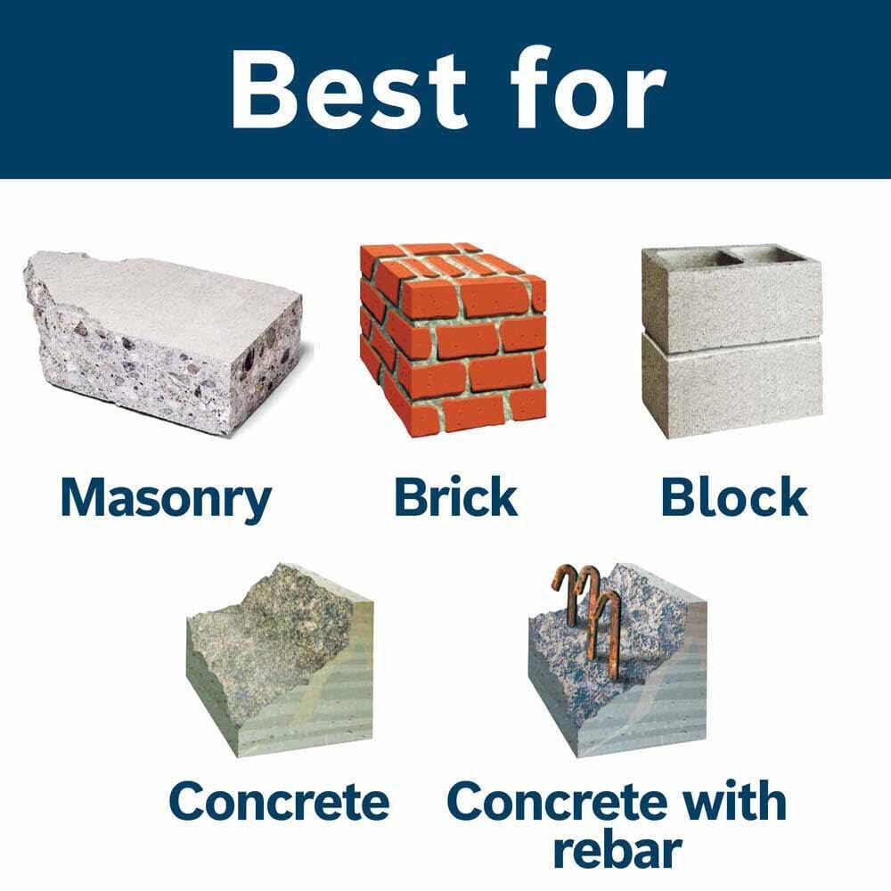 - Four-cutter head – provides four cutting edges to hit rebar, to help prevent the bit from getting stuck
