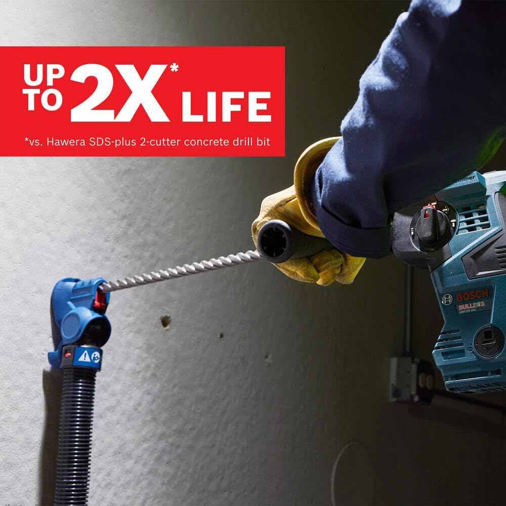 The Bosch Bulldog™ Tough Rotary Hammer Bit features a four-cutter head, for an SDS-plus® with fast drilling and enhanced durability in concrete with rebar. This bit delivers 2X life vs. standard SDS-plus® bits. These bits feature a four-cutter design, helping to prevent the bit from getting stuck in rebar, one cutting edge that hits the rebar no matter the angle, so it doesn’t get stuck and break. The four-flute design aggressively pulls dust away from the work, for fast drilling and longer bit life. This bit provides accurate centering, making it ideal for anchoring.
