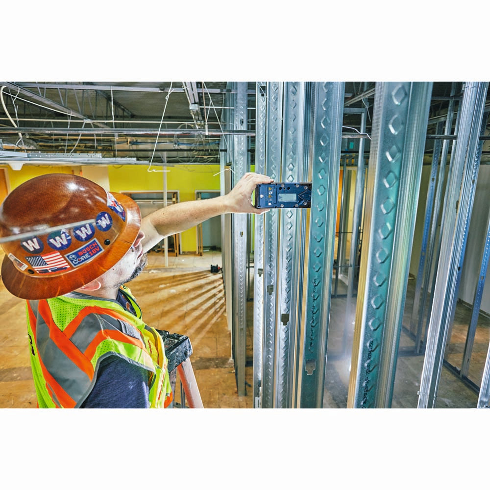 The Bosch LR40 Rotary Laser Receiver is designed to increase the GRL4000-80CH and GRL4000-80CHV rotary laser detection up to 2,000 Ft., with a dual-sided backlit LCD display for use in darker areas or outdoors on both sides of the receiver. It has built-in X and Y-axes buttons that allows for elevation and cut-and-fill calculations in both axes up to ±8.5°. The display illuminated large, easy-to-see indicators, including up/down arrows, center line, accuracy level, battery levels and audio signal. It also has LED indicators, to provide easy visual readout and simple operation. The oversized laser detection area helps find the laser beam faster, making it easier to start setting level. The receiver provides convenience features such as built-in magnets for secure attachment to metal surfaces, an adjustable audio indicator, intuitive six-button keypad, receiver vial, attachment hook and ergonomic soft grip.