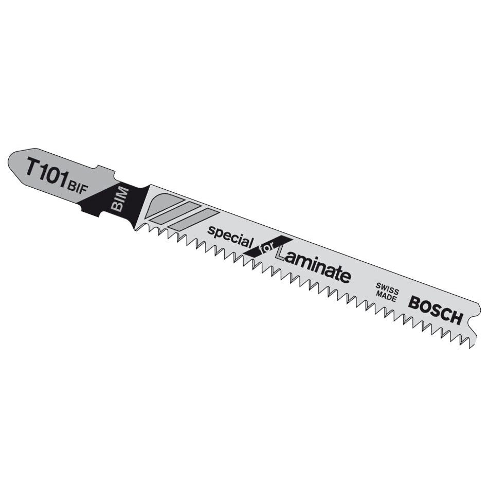 Bosch T101BIF 3-1/4" 14 TPI Special Laminate Cutting T-Shank Jig Saw Blades, 5 Pack. The Bosch T101BIF Jigsaw Blade is a long-life 15mm straight-cut blade designed for laminates and laminated panels. These bi-metal taper-ground jigsaw blades are manufactured to the highest quality, ensuring robust and sharp blades.