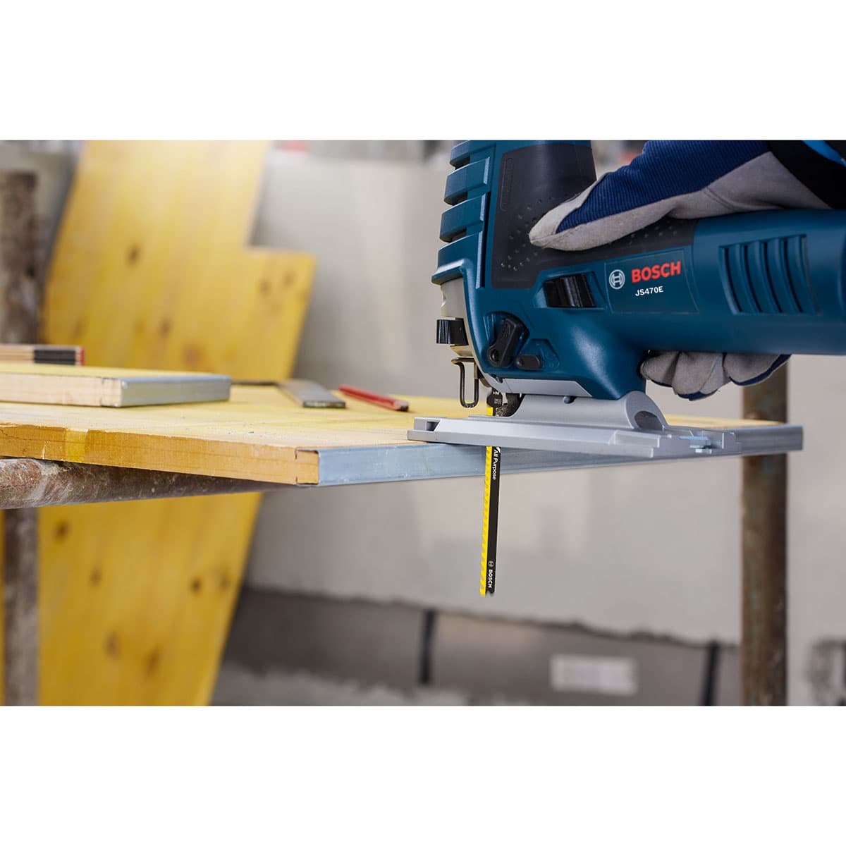 Bosch Carbide All-Purpose Jig Saw Blades are tough enough to withstand a nail hit and keep going – no change-out required. A Bosch-exclusive carbide brazing technology delivers 10X life versus standard bi-metal blades. This all-purpose blade does it all in tough wood with nails and hard materials such as thick gauge metal like stainless steel up to 1/8 In. thick. The blade employs Progressor Technology, a combination of aggressive small teeth that work together with larger teeth to increase speed and to provide fast cuts and excellent chip clearance. This is accentuated by the jig saw's pendulum movement. It has an exaggerated tip ensures easy plunge cuts, and the speed is further optimized by the jig saw’s pendulum movement being accentuated by the blade's tapered-ground back design. A thin blade kerf reduces material extraction, reduces heat and adds to performance.
