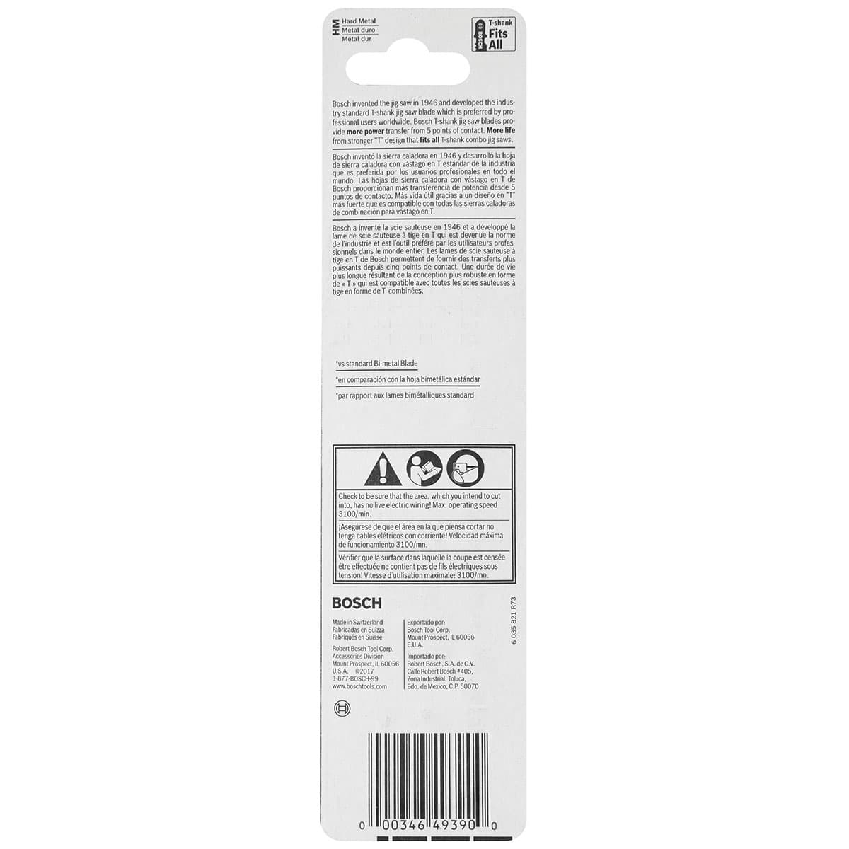Bosch Carbide All-Purpose Jig Saw Blades are tough enough to withstand a nail hit and keep going – no change-out required. A Bosch-exclusive carbide brazing technology delivers 10X life versus standard bi-metal blades. This all-purpose blade does it all in tough wood with nails and hard materials such as thick gauge metal like stainless steel up to 1/8 In. thick. The blade employs Progressor Technology, a combination of aggressive small teeth that work together with larger teeth to increase speed and to provide fast cuts and excellent chip clearance. This is accentuated by the jig saw's pendulum movement. It has an exaggerated tip ensures easy plunge cuts, and the speed is further optimized by the jig saw’s pendulum movement being accentuated by the blade's tapered-ground back design. A thin blade kerf reduces material extraction, reduces heat and adds to performance.