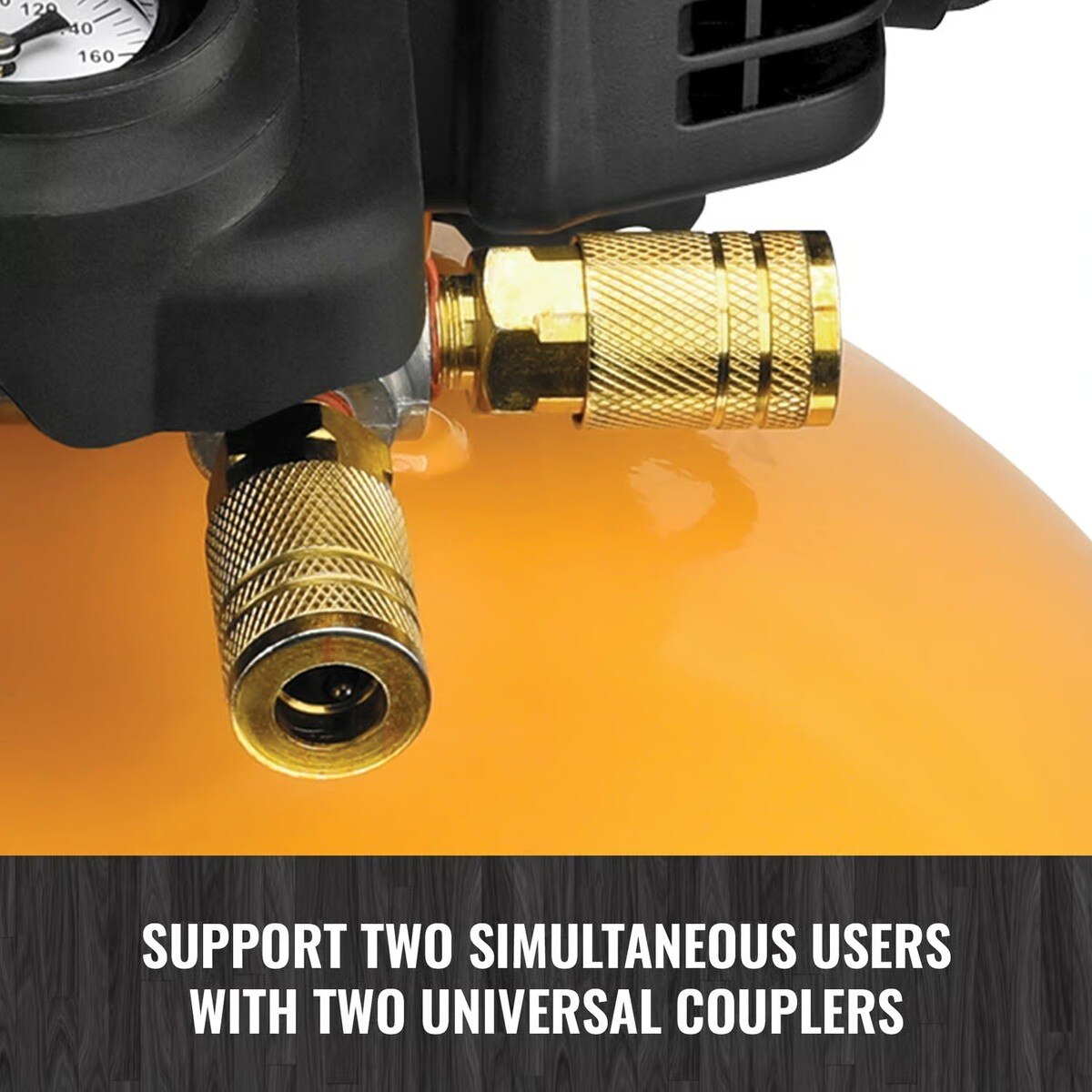 This Bostitch 6-gallon pancake air compressor delivers up to 150 PSI with an oil-free, maintenance-free pump and a high efficiency motor designed for easy starting in cold weather or when using an extension cord. Compact and portable, it features a high flow regulator and dual universal couplers to support two users.