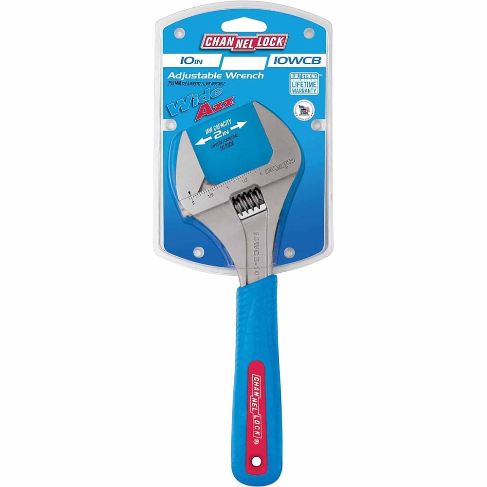 The CHANNELLOCK® 10WCB 10-inch WIDEAZZ® Adjustable Wrench features a super wide 2-inch jaw opening, providing 72% wider jaw capacity of standard wrenches of the same size - All in a lightweight, compact 10-inch adjustable wrench supporting larger nuts and bolt sizes. The combination of a smart and comfortable tapered handle design with CODE BLUE® grips, precise 4-thread knurl and minimal head width greatly improves performance in confined spaces. CHANNELLOCK® Adjustable Wrenches are made in Spain and forged from rugged chrome vanadium steel.