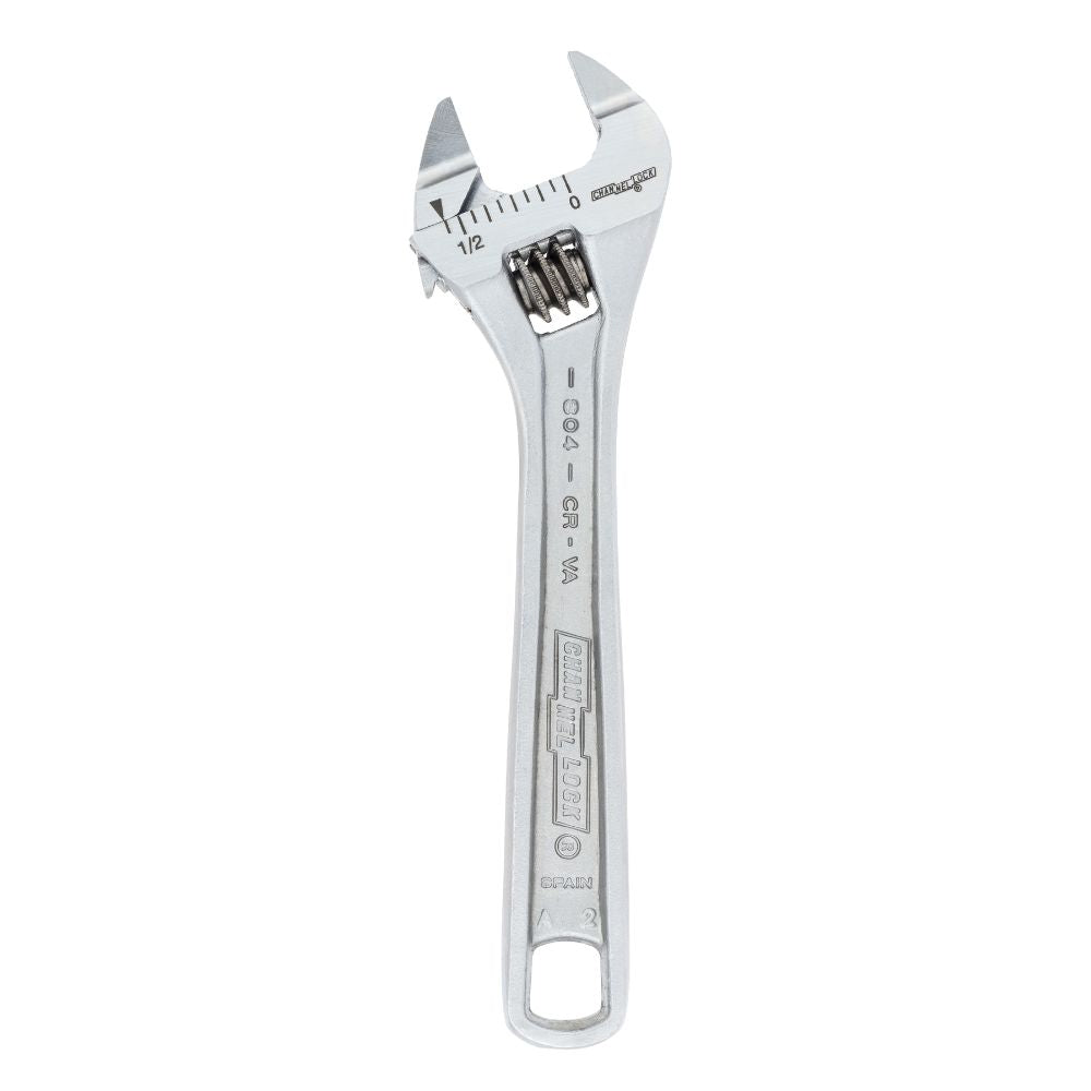 The CHANNELLOCK 804S Xtra Slim Jaw Adjustable Wrench features 45% slimmer jaws than a standard wrench of its size. The combination of a smart and comfortable tapered handle design, 4-thread knurl and minimal head width provides precise performance in confined spaces. CHANNELLOCK Adjustable Wrenches are made in Spain and forged from rugged chrome vanadium steel.