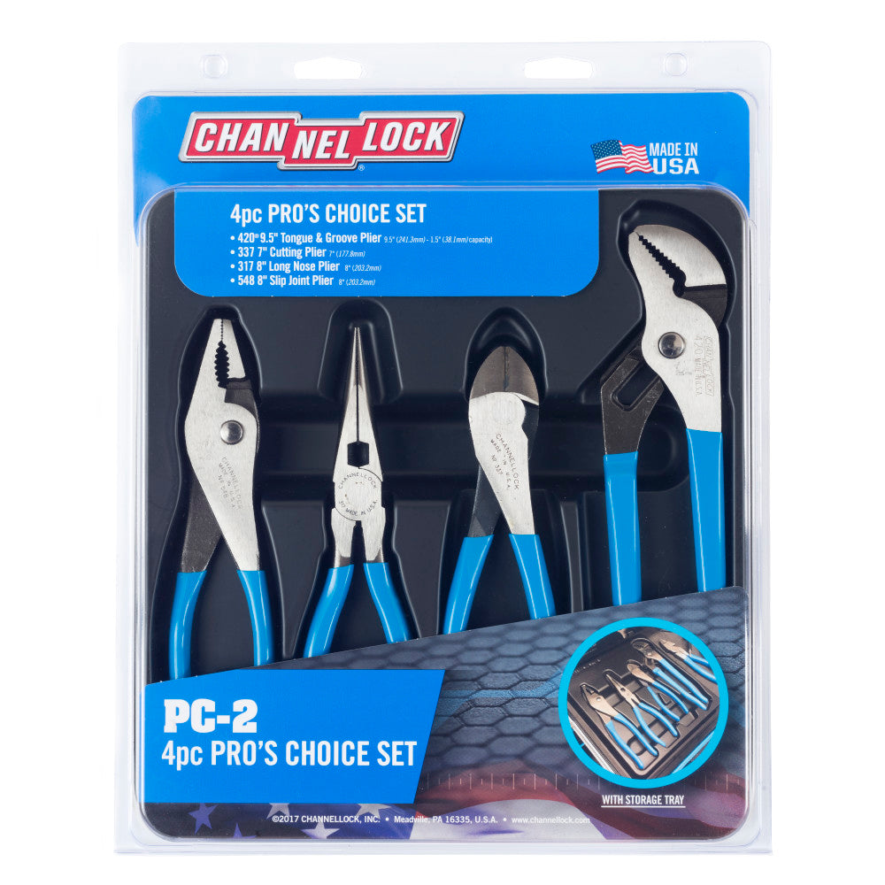 The CHANNELLOCK PC-2 Pro's Choice 4pc Plier set come with a 9.5" Tongue & Groove, 7" HL Diag Cutting plier, 8" Long Nose, and 8" HD Slip Joint all packaged with a bonus tool tray for convenient storage. Model 420 9.5" Tongue and Groove plier is built to last with a PermaLock fastener to eliminate nut and bolt failure, patented reinforcing edge to minimize stress breakage and right angle, laser heat-treated teeth to provide a better, longer lasting grip. Model 337 7" HL Diag Cutting Plier uses precision knife and anvil cutters to ensure proper cutting edge alignment, resulting in a clean cut every time. Model 317 8" Long Nose Plier is engineered to operate in tight spaces. A crosshatched teeth pattern provides reliable grip in either direction, while a narrow nose profile provides extra precision. Model 528 8" Heavy Duty Slip Joint Plier is easy to use and comes with legendary strength and reliability. Crosshatch pattern on jaws grips work tightly and the PermaLock fastener eliminates nut and bolt failure.