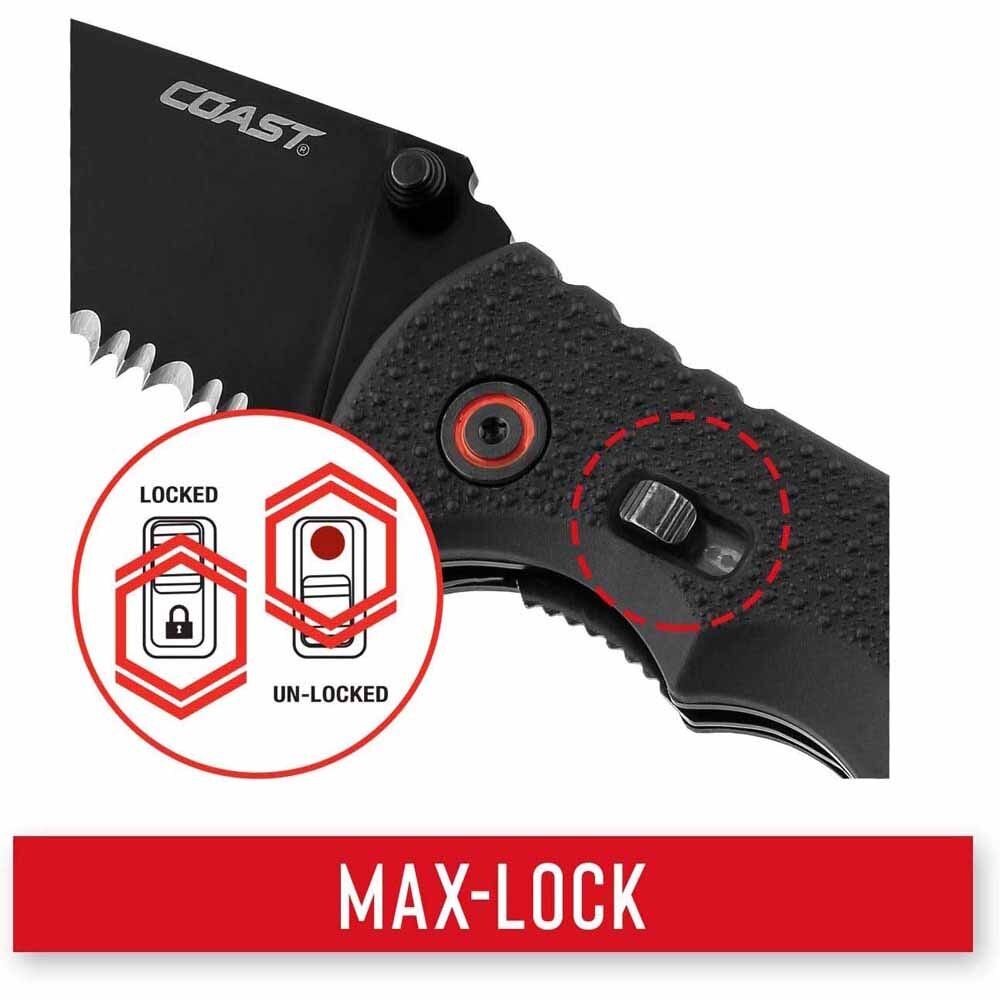- Max-Lock: Safety, maximized. COAST’s Max-Lock system locks the blade in both open and closed positions. When locked closed, it prevents the assisted opening mechanism from engaging in your pocket. When locked open, it ensures the blade won’t accidentally close during use. Coupled with a standard Liner-Lock, Max-Lock provides double the safety.