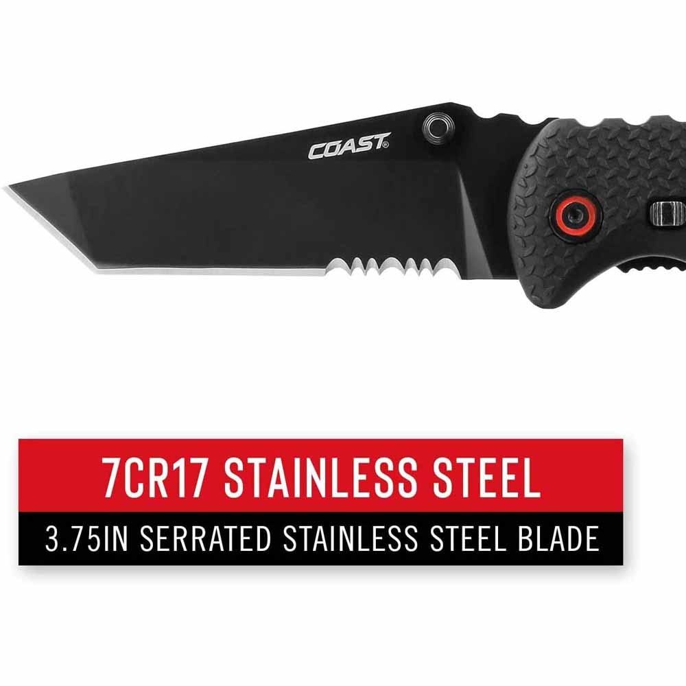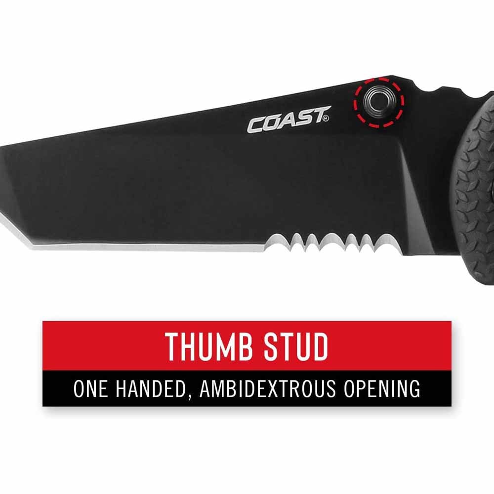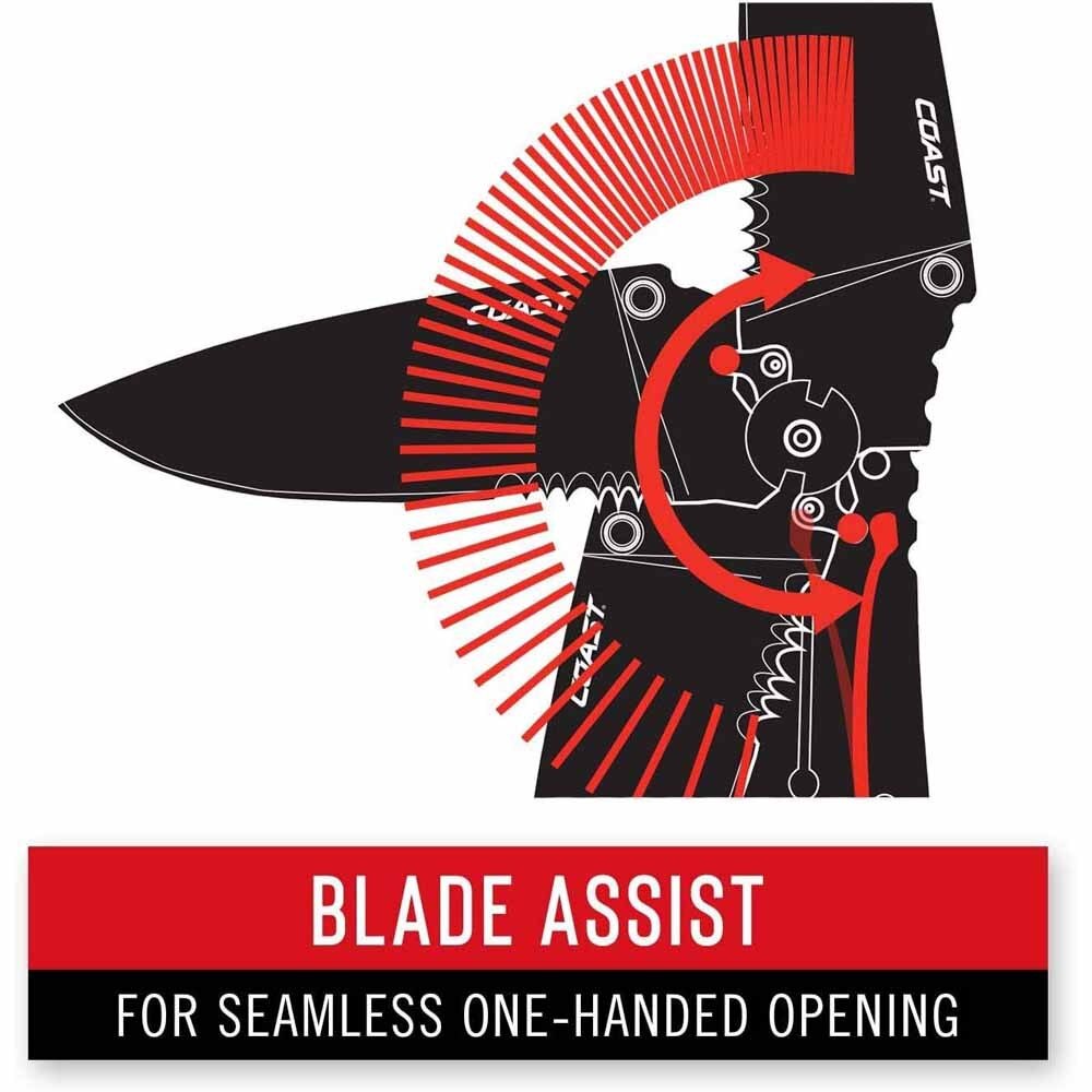 - Blade Assist: Open your knife in a flash. COAST’s Blade Assist mechanism uses a proprietary opening system that releases the blade faster, smoother, and more safely than other blade-assist designs. Simply push the studs on the side of the blade, and it pops open. Only available on knives equipped with the Max-Lock system.