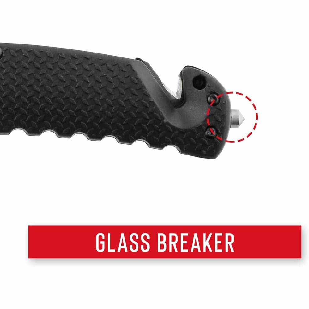 - Glass Breaker: Escape in an emergency. The sharp point of the Glass Breaker, positioned at the tail end of the knife handle, allows you to easily shatter auto glass when you need to exit a vehicle quickly.