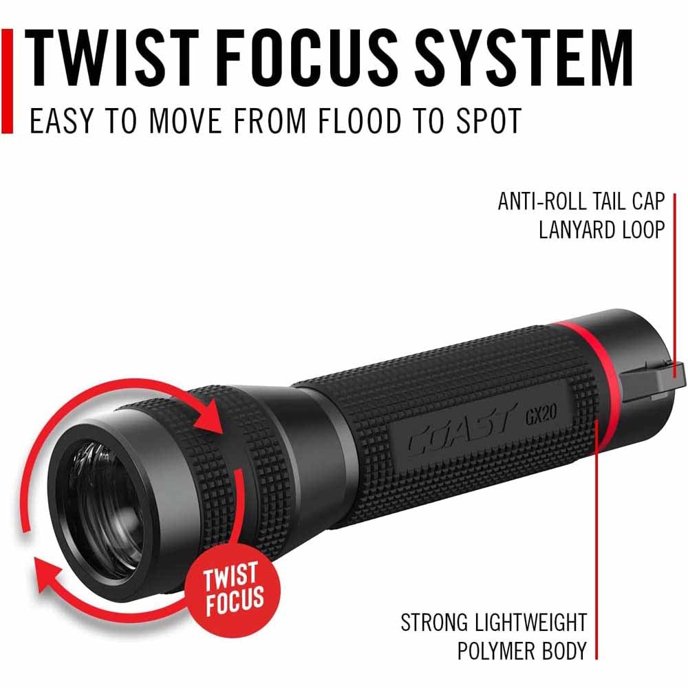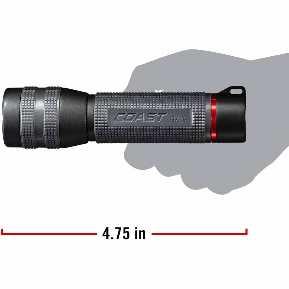The Coast GX20 1200 Lumen Waterproof Dual Power Rechargeable LED Flashlight offers powerful lighting with four modes—medium, high, Turbo, and low—delivering a max output of 1200 lumens. It features the COAST PURE BEAM® optic and TWIST™ focus system for seamless transitions between Ultra View Flood and BULLS-EYE™ Spot beams. Built to withstand storms, splashes, and submersion up to 1 meter (3 feet), the lightweight, waterproof flashlight has a textured handle with an anti-roll tail cap. Powered by four AAA batteries or a COAST ZITHION-X™ ZX750 rechargeable battery (sold separately), it meets IP67 waterproof and dust-resistant standards and comes with a lifetime warranty.