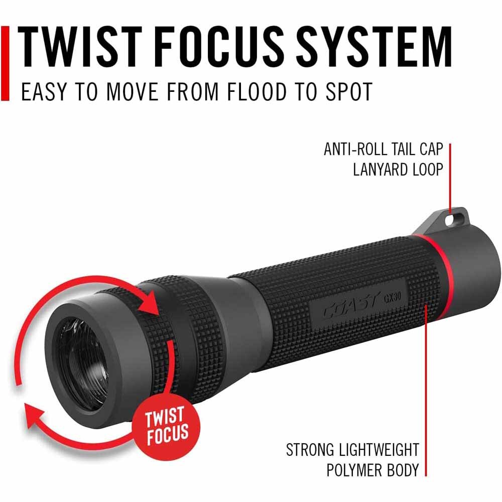 - Twist Focus: Dial in the shape of light you need for the situation. COAST’s TWIST FOCUS™ system makes it easy to move between spot and flood beams by simply rotating the head of the flashlight.