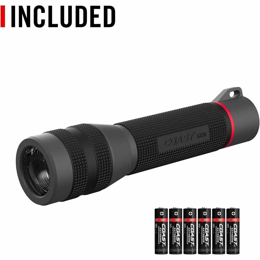 The Coast GX30 Waterproof Dual Power LED Flashlight delivers powerful lighting with four modes—medium, high, Turbo, and low—peaking at 2300 lumens. Built with a lightweight polymer handle and sealed for IPX7 waterproof protection, it can withstand submersion up to 1 meter. The COAST PURE BEAM® optic and TWIST™ focus system provide seamless transitions between Ultra View Flood and BULLS-EYE™ Spot Beams. The flashlight features an anti-roll tail cap, grip-textured handle, and a lanyard loop for easy carrying. Powered by six AA batteries or a COAST ZITHION-X™ ZX866 rechargeable battery (sold separately), it meets IP67 waterproof and dust-resistant standards and comes with a lifetime warranty.