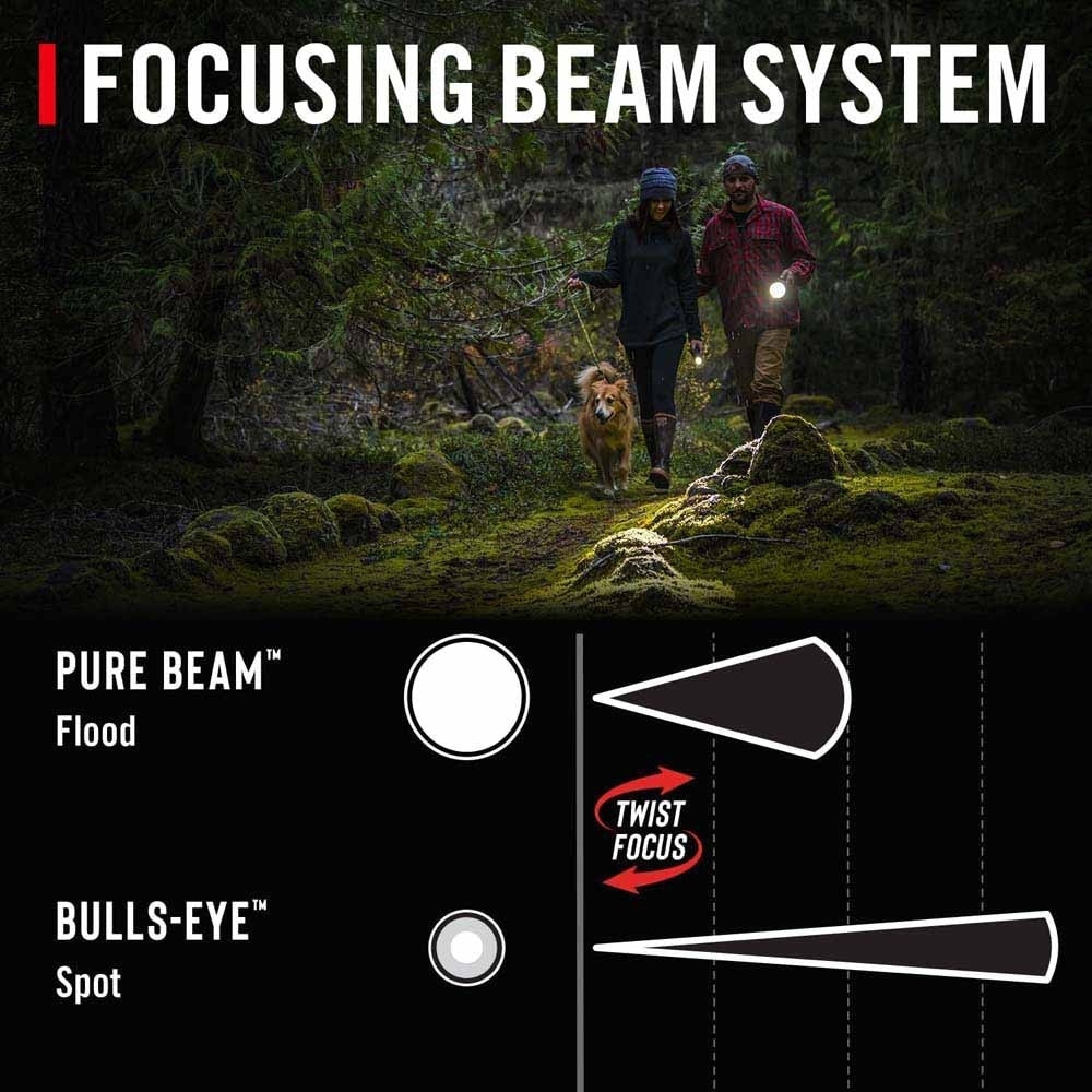 - Pure-Beam Focusing Optic: Seamlessly transition between short and long-range beams without halos or hot spots. The Ultra View Flood beam offers edge-to-edge clarity in a wide circle, while the BULLS-EYE™ Spot Beam projects a sharp, focused light with a transitional halo for extended viewing.