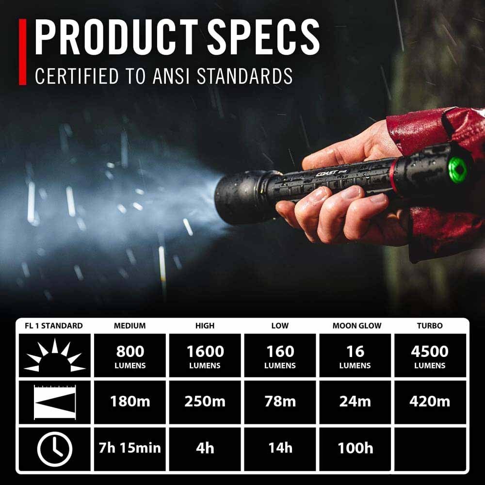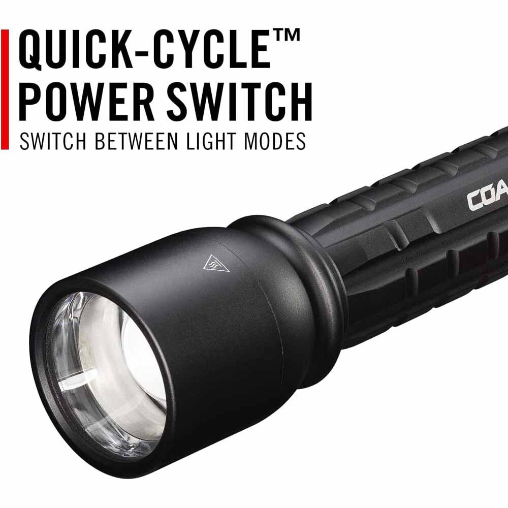 - Pure Beam Focusing Optic: COAST’s patented technology combines two powerful beams in one, allowing you to smoothly transition between the Ultra View Flood Beam for wide-area clarity and the BULLS-EYE™ Spot Beam for long-range focus, with no halos or hot spots.